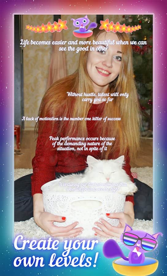 Mutlu Tarz - Oyna, Rahatla, Hayal Et, Yaşa! – Kurt Adam veya 'Dönüşüm' türünde yenilikçi bir şey. Her gün için Android uygulaması olan bu uygulama, sizi rahatlatacak, canlandıracak ve iyi bir ruh hali verecek. Bu oyun oldukça çeşitlidir. Öncelikle, sizi sıcak bir sözle destekleyen ve yeni başarılar ve kahramanlıklar için ilham verecek bir moral yükseltici uygulamadır. Tamamen tükenmiş veya hiçbir şey yapmak istemiyorsanız, sadece Mutlu Tarz'ı başlatın. Hemen kendinizle gurur duymak için tüm nedenleri hatırlayacak ve hayallerinizi ve arzularınızı yeniden gözden geçireceksiniz! İkincisi, bir zamanlar söylediğiniz tüm güzel sözleri kullanan dinamik bir oyun sürecine sahip standart dışı bir arcade oyunudur. Oyun, sinirli ve gergin insanları sakinleştirmek ve sinirlerini korumak amacıyla yaratılmıştır. Ayrıca, tamamen yabancı ama aynı zamanda kendinize ait bir hikaye öğreneceğiniz bir hikaye modu da vardır.