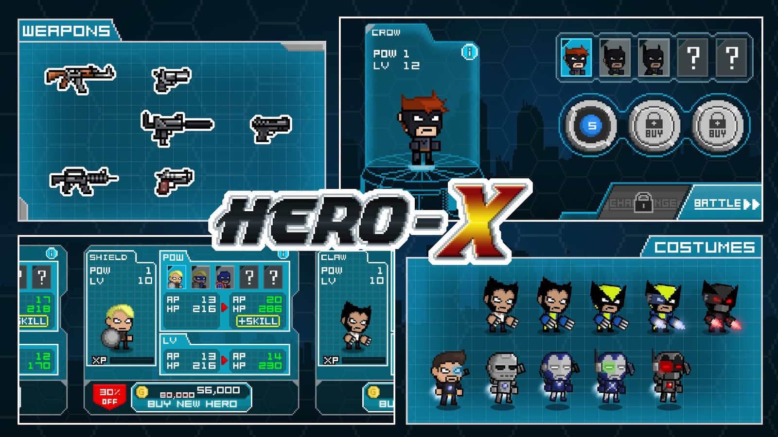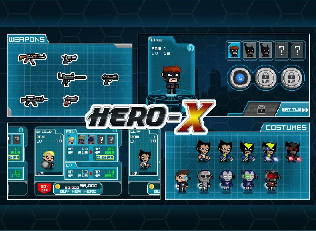 HERO-X – bilinmeyen bir çete ordusu şehrinizi işgal ediyor ve neredeyse tüm binaları kontrolü altına almış durumda. Hiçbir yerden yardım beklemeyin, tek umut süper kahramanda, şehirdeki kanlı çetelerden kurtulmak için yardım edebilecek olan. Kendi süper kahramanınızı yaratın, ona kıyafet seçin ve kötülüğü yenmeye doğru yola çıkın. Her kahramanın kendine özgü saldırıları vardır, ayrıca çeşitli vuruş kombinasyonları yapabilirsiniz. Bu kombinasyonlar en dayanıklı savaşçıları bile şoka sokabilir.