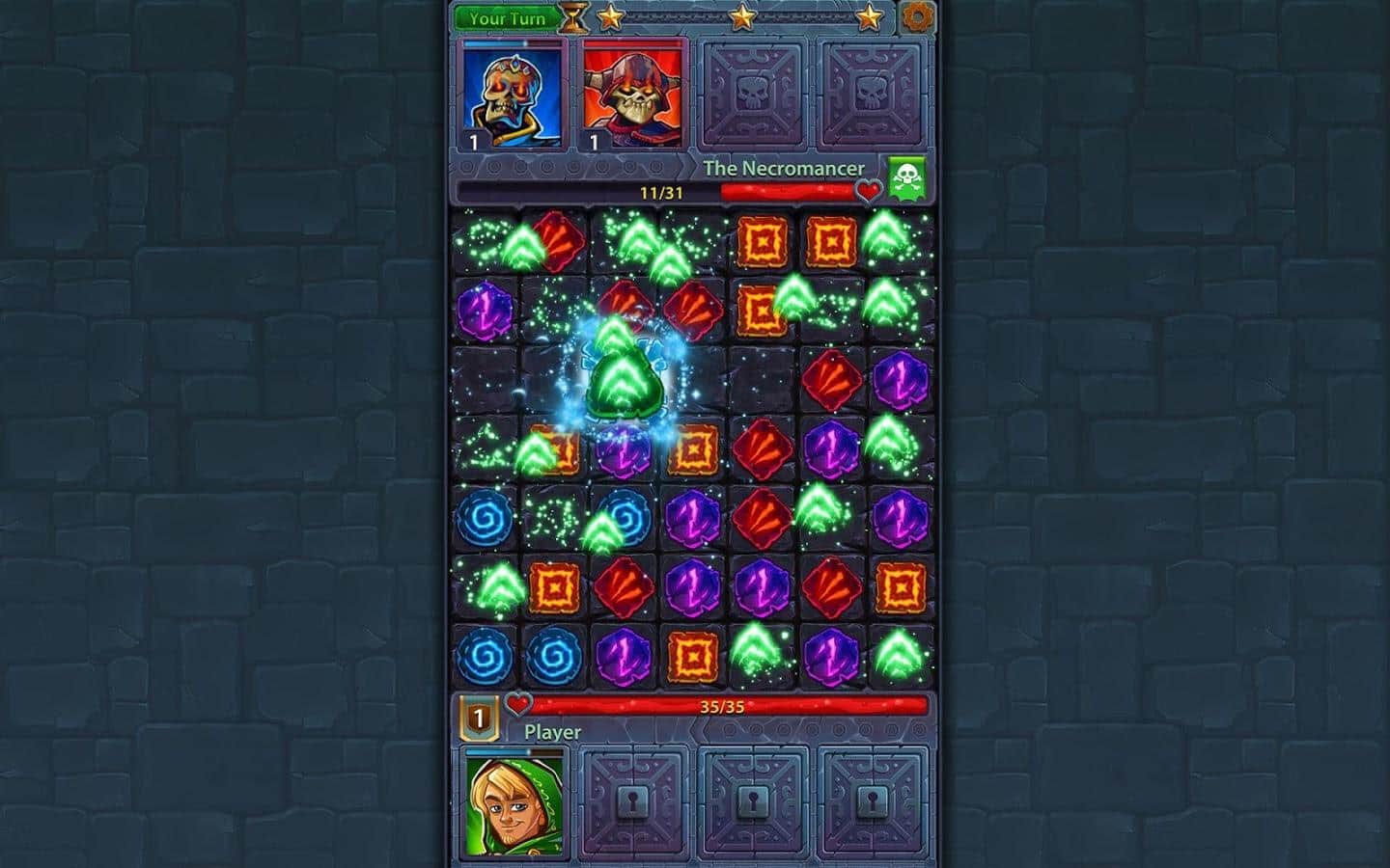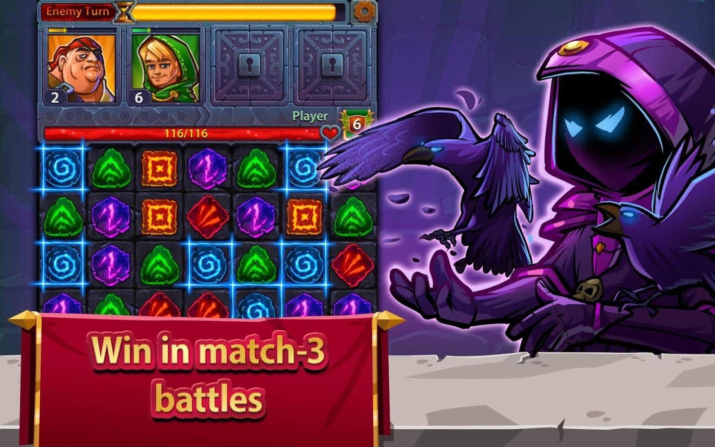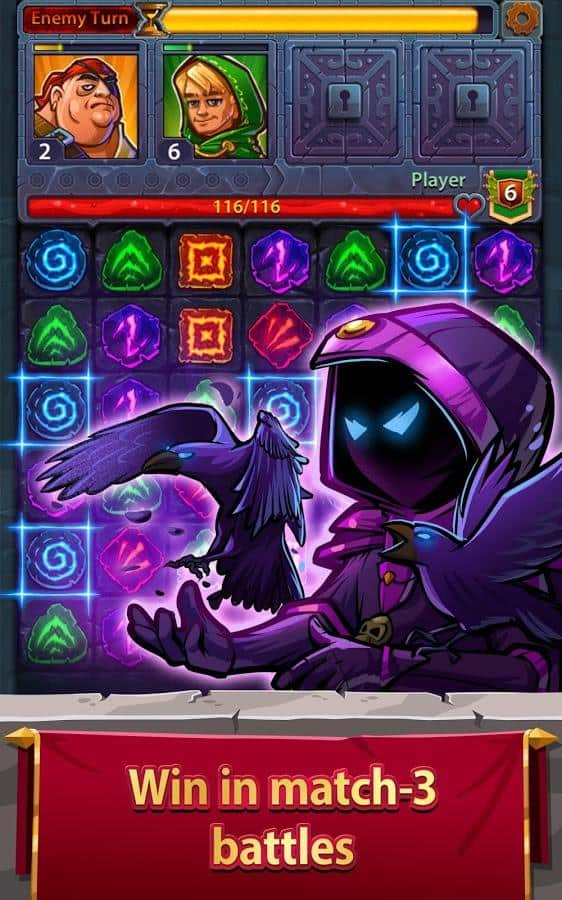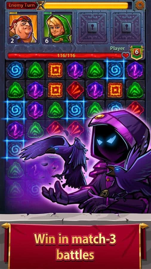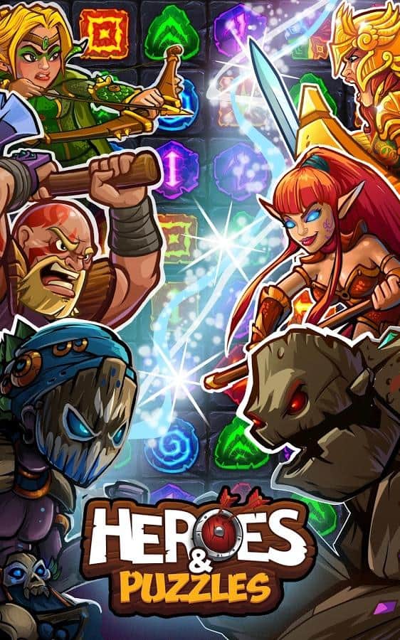 Kahramanlar ve Bulmacalar – basit ama bir o kadar da ilginç bir oyun, rol yapma oyununu ve klasik 'üçlü eşleştirme' türünü bir araya getiriyor. Büyülü dünya, kahramanını bekliyor. Yenilmez kahramanlardan oluşan ekibinizi toplayın. Onlar için silah ve zırh seçin ve adalet sağlamak ve bu huzursuz zamanlarda Krallık'ta barış ve düzeni sağlamak için yola çıkın. Kombinasyonlar oluşturun ve bunlar sayesinde çeşitli canavarlara karşı zafer kazanın. Kombinasyon ne kadar büyükse, zafer şansı o kadar yüksek olur çünkü bu sayede kahramanlarınızın yeteneklerini artırabilirsiniz. Oyunda çok sayıda kahraman var. Onların tam koleksiyonunu toplamayı deneyin. Her savaş sonrası kahramanlarınız seviye atlar ve özelliklerini geliştirir.