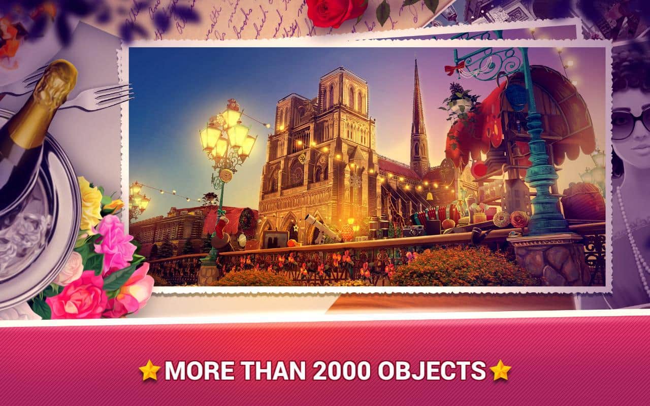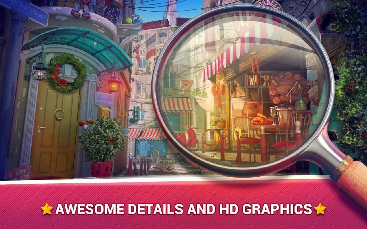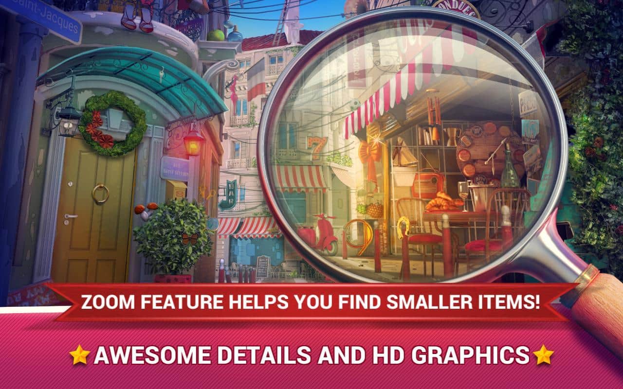 Gizli Nesneler - Paris'te Aşk, gizli nesneleri bulmaya yönelik harika bir Android oyunudur. Bu oyunda, ihtiyaç duyduğunuz nesneleri arayacağınız güzel ve masalsı mekanların dünyasına dalacaksınız. Sayısız mekanda dolaşın ve 2000'den fazla çeşitli nesne toplayın. Bu oyunu oynayın ve gözlem yeteneğinizi, dikkatli bakışınızı ve bu oyun için gereken diğer yeteneklerinizi test edin. Yakınlaştırma veya uzaklaştırma ile resmi büyütün veya küçültün, bu size aradığınız nesneyi daha hızlı bulmanıza ve seviyeyi geçmenize yardımcı olacaktır. Her yeni seviyede oyunun zorluğu artacak ve ipuçlarından yardım almak zorunda kalacaksınız. Bu oyunu oynayın ve keyifli müzik eşliğinde, çok sayıda nesne ve muhteşem grafiklerin tadını çıkarın.