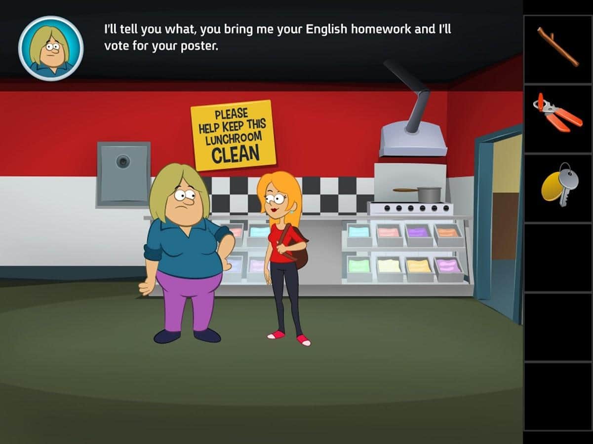 Lise Macerası - Lise her zaman sayısız ilginç yarışma ve macera ile doludur. Ellie ve Alex'in kazanmak için tüm çabalarını göstermek istediklerinde karşılaştıkları durumu göz ardı etmeyin. Onları durduran tek şey - zorba Buster. Gerekli eşyaları bulmak için odalarda zaman ayırın, karşılaştığınız insanlarla konuşun ve onlara yardım edin, her türlü engeli aşın, karmaşık bulmacaları çözün ve mantık yeteneğinizi test edin. Eğlenin ve keyif alın, aksi takdirde sadece zafer için neden burada olasınız?