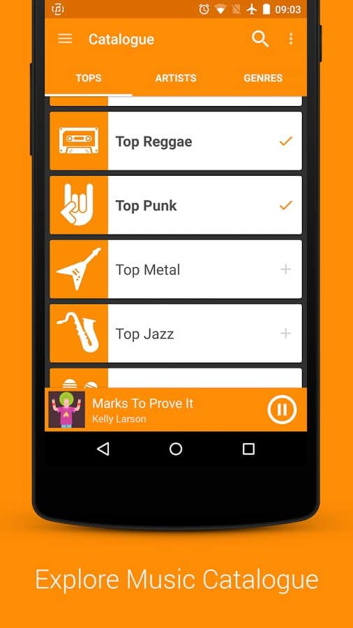 Parçalar, sanatçılara, türlere ve hatta coğrafi kökenlere göre aranabilir. Sunulan fonotekten kendi çalma listelerinizi oluşturabilir ve bunları çevrimdışı dinlemek için kaydedebilirsiniz. Katalogun yanı sıra, uygulama temel işlevlere sahip basit bir çalar içerir.