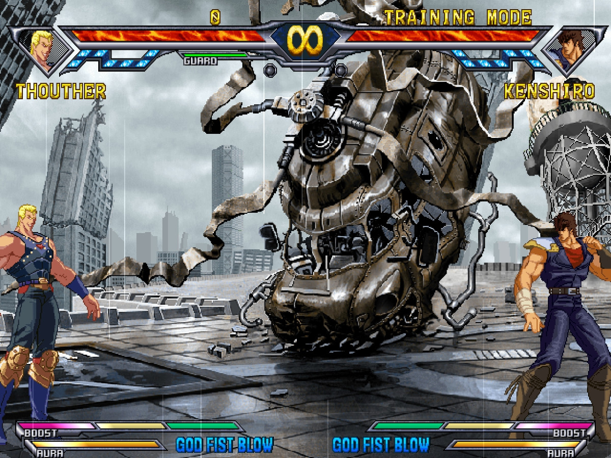 Hokuto no Ken: Shinpanno Sousousei Kengou Retsuden — 2D bir dövüş oyunudur. Oyun sistemi, kombolar, özel hareketler ve savaş sonucunu etkileyen yedi yıldızın benzersiz mekanizmasını içerir. Karakterin yıldız seviyesi sıfıra düştüğünde, o, anında raundu sona erdiren fatal bir darbeye karşı savunmasız hale gelir. Oyunda Kenşiro, Rao, Toki, Şina ve diğerleri dahil olmak üzere 10 karakter bulunmaktadır. Her dövüşçünün kendine özgü yetenekleri vardır ve savaşlar, Hokuto no Ken evreninin ikonik lokasyonlarında, Güney Haçı ve yıkılmış şehirler gibi yerlerde geçmektedir. Oyun, hikaye modu, arcade, antrenman ve karşılaşma modlarıyla birlikte sunulmaktadır.