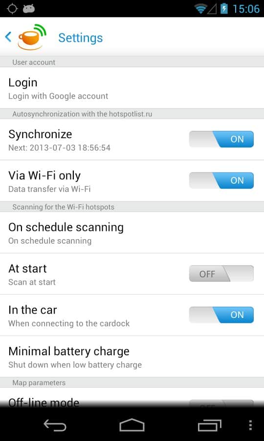 - Programın çevrimdışı çalışma modu (bölge haritası ve bölgedeki WiFi noktaları hakkında bilgi indirilir)