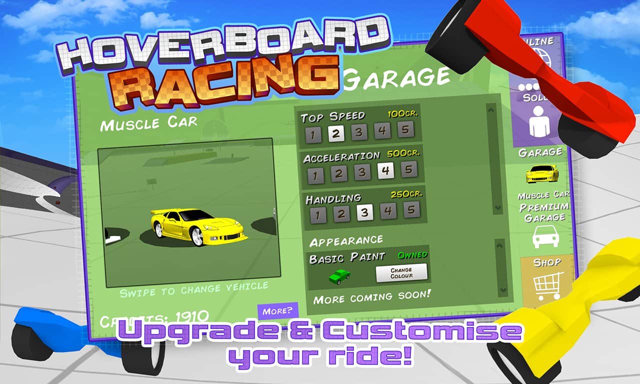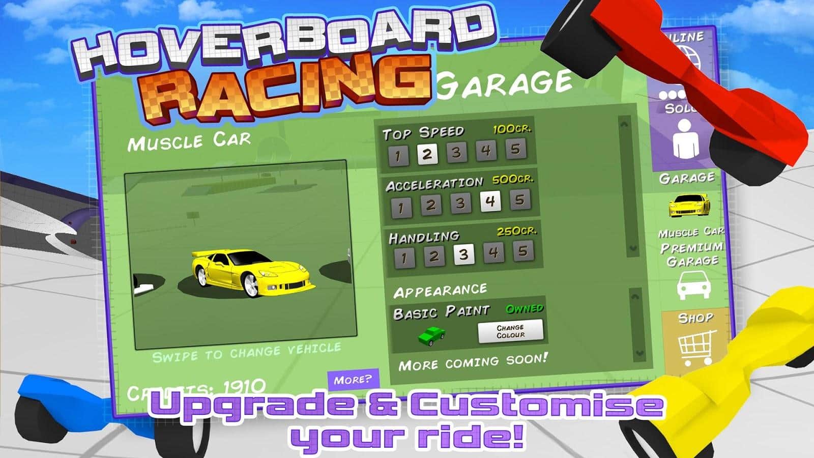Eşsiz bir arenanın etrafında, oyuncunun hoverboard sürme konusunda uzmanlaşması için hızlı hareket etmesi gerekecek. Hoverboard Yarışı geliştiricileri, çok oyunculu, bayrak kapmaca, zombi saldırısı ve jeton toplama gibi birkaç oyun modu sunuyor. Her seferinde oyuncunun, lokasyonda hızlı hareketle yeni bir görevi yerine getirmesi gerekecek, böylece kısa bir sürede hedefine ulaşarak aynı lokasyonda rekabet eden diğer oyuncuları geride bırakabilir. Yeni bir araç satın al ve mevcut olanı geliştir, böylece daha iyi sonuçlar elde et.
