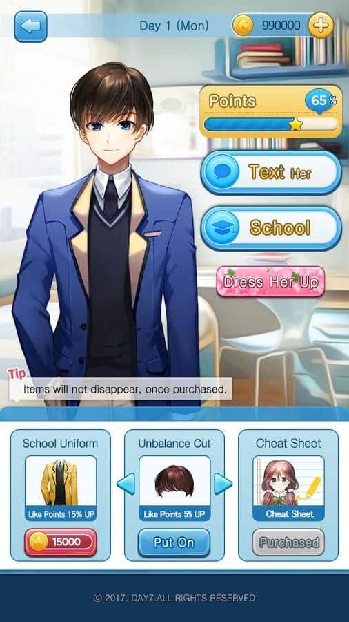 33 Günde Kız Nasıl Elde Edilir – öğrencilerin romantik ilişkiler kurmalarına yardımcı olacağınız ilgi çekici bir android simülatörü. Kendinize bir kahraman seçin, ona uygun bir görünüm seçin ve derse gitmek için okula gidin, yeni arkadaşlar edinerek. Bu okulda hayalinizdeki kızı bulacak ve onun kalbini kazanmak isteyeceksiniz. Fısıldaşın ve çeşitli kızlarla iletişim kurun, randevuya çıkın ve lise öğrencisi olarak heyecan verici bir hayat yaşayın. Ana karakterin kaderini belirleyin ve okulun en popüler kızının sevgilisi olun.