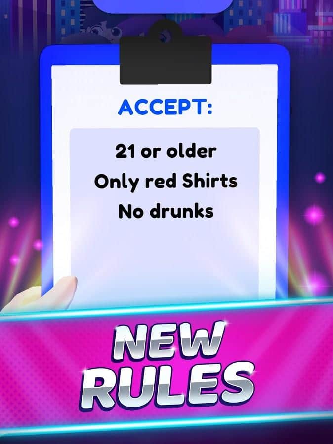 ID Lütfen - Kulüp Simülasyonu - hiç gece kulübüne alınmadınız mı? Artık kimlerin içeri gireceğine ve kimlerin kapıda kalacağına sadece siz karar vereceksiniz. Şehrin en iyi gece kulübünün yeni kapıcısısınız, ana göreviniz sarhoşların ve serserilerin kulübe girmesini engellemektir. Kulüp sahibi sıkı bir yüz kontrolü uyguladı, kulübüne yalnızca en iyiler girebilir. Ayakkabısız ve uygun olmayan kıyafetlerle gelenleri içeri almayın. Sıradaki müşteriler sürekli olarak yanınızdan kaymaya çalışacak, dikkatli olun ve kulüpteki düzeni sağlamayı unutmayın, sürekli gelen ziyaretçiler sık sık kavgalar çıkarır. Düzeni koruyun ve kulüpteki eğlence seviyesini yüksek tutun!