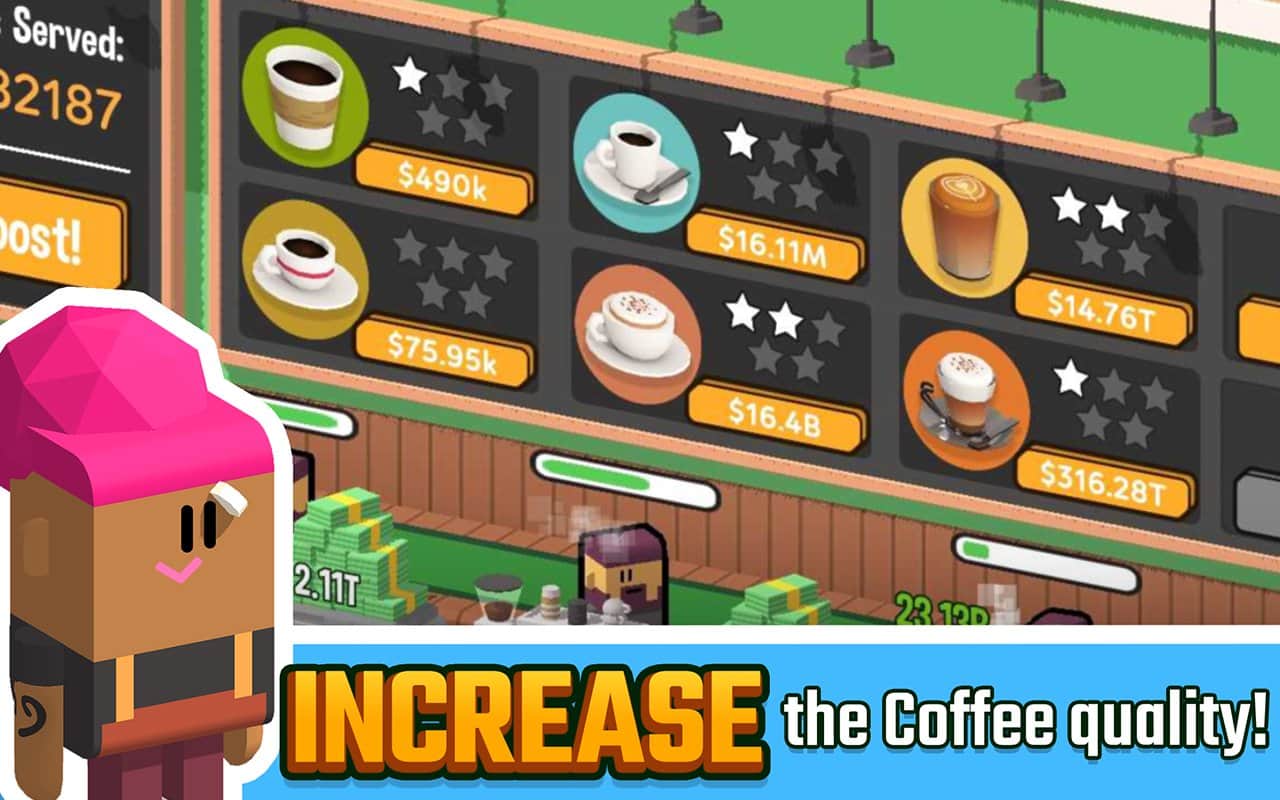Idle Coffee Corp - sizi küçük bir kafeyi yönetmeye ve onu kârlı bir işletmeye dönüştürmeye davet eden eğlenceli bir arcade oyunu ve yemek simülatörü unsurlarıyla dolu. Oynanış, rahat bir arcade, tıklama ve ekonomik simülatör unsurlarını birleştiriyor. Hoş çizim grafikleri, basit kontroller ve geniş oyun olanakları size birçok keyifli an sunacak.