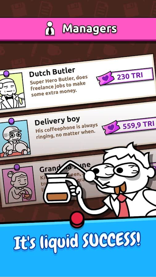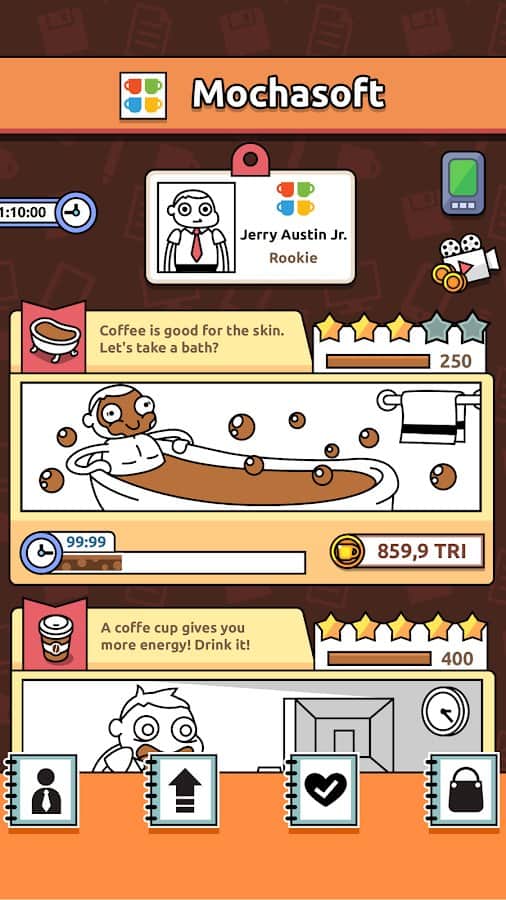 Idle Coffee Inc. - Kafein Acele Simülatörü Tıkla – kahve içen ana karakteri yöneteceğiniz bir tıklama oyunu. Kahramanımız işinde mükemmel sonuçlar elde etmek ve kariyer basamaklarını mümkün olduğunca hızlı çıkmak istiyor. Bunun için kahveden aldığı enerjiye ihtiyacı var, bu yüzden telefonunuzun veya tabletinizin ekranına olabildiğince sık tıklayarak kahramanı kahve içirmeye ve işini sorumlu bir şekilde yapmaya teşvik edin. Kahramanın kanındaki kafein seviyesinin düşmesine izin vermeyin ve günde mümkün olduğunca fazla fincan kahve için. Oyun, oyuncuları harika çizilmiş grafikleri ve kolay kontrolleriyle mutlu edecek.