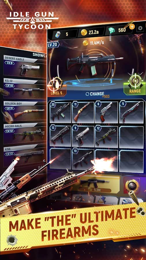 Tembel Silah Mülkü - Android için tamamen etkileşimli bir gerçek dünya deneyimi sunan bir tıklama oyunudur. Oyunda 50'den fazla ateşli silah mevcuttur. Aynı silahları birleştirerek daha yüksek seviyede yeni bir silah elde edin. Paralarınızı akıllıca yatırarak altın gelirlerinizi artırın, böylece daha zengin hale gelin ve daha güçlü silahlar satın alın. Yapmanız gereken tek şey nişan almak ve hedefi vurmak için ateş etmektir.