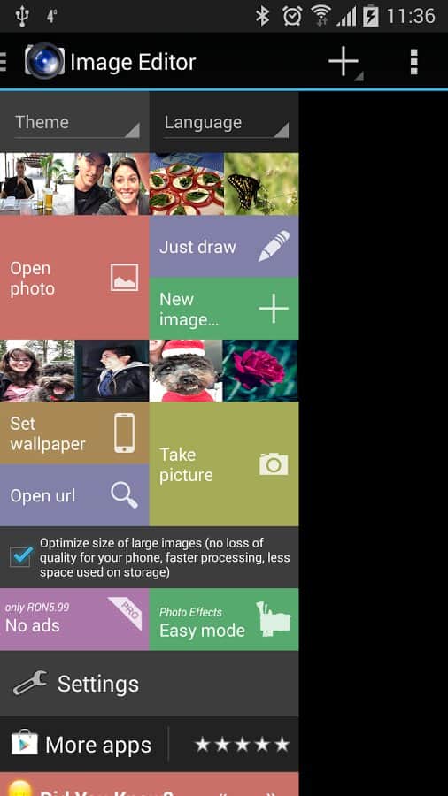 Resim Düzenleyici - Bu uygulama, tüm temel işlevlerin kategorilere ayrıldığı ve düzenli bir şekilde sıralandığı basit ve çok yönlü bir fotoğraf düzenleyicisidir. Ayrıca, sadece bir düğmeye basarak herhangi bir fotoğrafınızı duvar kağıdı olarak ayarlayabilirsiniz. Burada gerçekten çok sayıda araç var, sıradan filtrelerden başlayarak birçok çıkartma ve resme kadar.