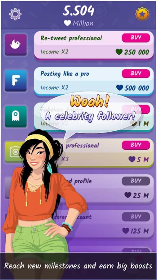 Etkileyici – Android için benzersiz bir simülatör, burada medya kişiliği rolünü üstleneceksiniz. Bu oyunda ana göreviniz yeni takipçiler kazanarak sosyal medya gruplarınızı tanıtmak ve popüler hale getirmektir. Beğeni ve takipçi sayınızı artırmak için elinizden gelen her şeyi yapın. Yeni takipçiler kazanmak için tüm boş zamanınızı yeni gönderiler ve fotoğraflar paylaşarak harcayın. En ünlü kişilik olun ve kalabalık hayranlar kazanın, aynı zamanda moda yasası haline gelin. Hesaplarınızı, ekrana parmağınızla dokunarak geliştirin.