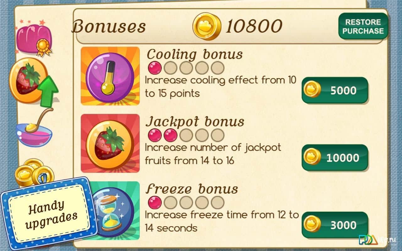 Jöle Meyve - Android için bir oyun, burada meyve jölesi yapmanız gerekiyor. Göreviniz, ekrana dokunarak jöleyi sert veya yumuşak hale getirmek; jöle sıvıyken içine sulu meyveler eklemek ve çeşitli böceklerin içine girmesine izin vermemek. Çeşitli meyvelerden tonlarca ve 48 meyve jölesi tarifi sizi sıkılmaktan alıkoyacak. Ayrıca sizi 3 oyun modu ve renkli HD grafikler bekliyor.