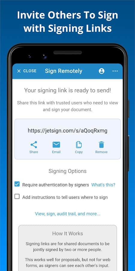Günümüzde imzayı herhangi bir belgeye veya dosyaya birkaç saniye içinde, baskı ve tarama gibi gereksiz işlemlerle uğraşmadan ekleyebilirsiniz! Metin boyutunu değiştirin, onay kutuları ve çarpı işaretleri ekleyin, alanları kopyalayın, gerekli formları hızlıca doldurun ve dosyaların her formatını kendi telefonunuza kaydedin. İmzanızla belgeleri kopyalanmış bağlantı veya e-posta aracılığıyla ikinci imzalayan tarafa gönderin. Gerekli baş harfleri, tarihi ve diğer imza için yeri kendiniz ekleyin.