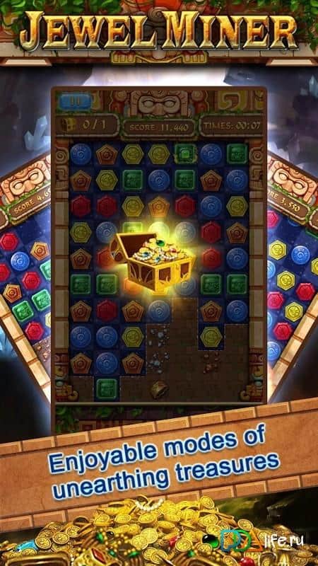 Birinci mod maden, burada üç veya daha fazla aynı taşları bir sıraya yerleştirerek hazine sandığını kazanmak için madeni kazmak zorundasınız.