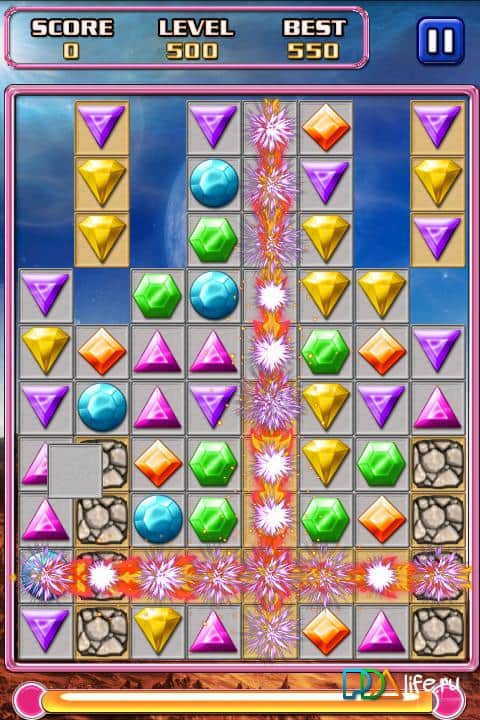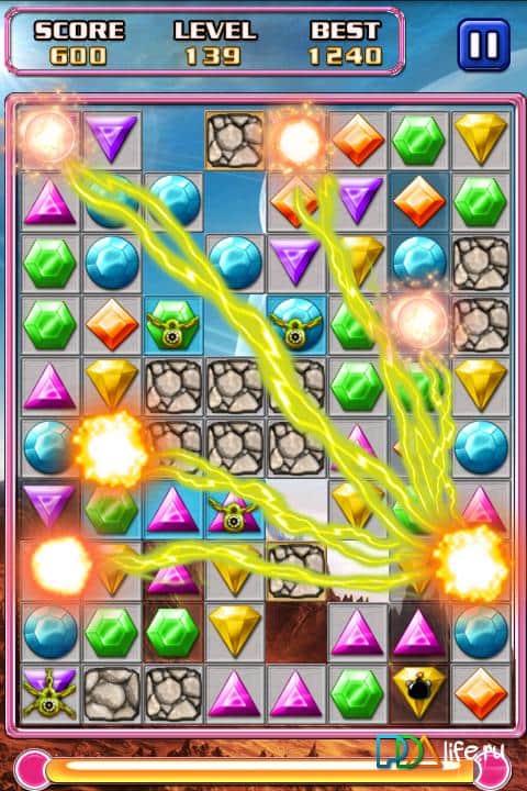 Mücevherler Kırıcı - Android için bir oyun, üçlü eşleşme türünde, burada kristalleri bir sıraya yerleştirmeniz gerekiyor. Taşları, dikeyde, yatayda ve tüm diagonallerde renklerin eşleşmesini sağlayarak yerleştirin ve böylece kaybolsunlar. Aynı renkten mümkün olduğunca fazla taşı bir sıraya toplayarak kombine vuruşlar yapın ve maksimum puanı kazanın. Bu oyunda sizi hoş bir grafik ve bu türü sevenlerin tamamlamak isteyeceği 300'den fazla seviye bekliyor.