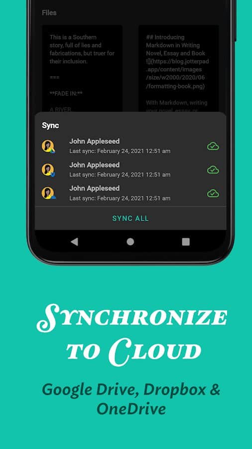 JotterPad - senaryolar, hikayeler ve romanlar - Düşüncelerimiz, konuşma ve metin aracılığıyla aktarılabilen en özel olgudur. Bu kullanışlı düzenleyici ile bir roman, şiir, kitap, deneme, senaryo veya proje yazın ve kendi düşüncelerinizin akışının tadını çıkarın. Uygulamada birçok faydalı özellik var, bunlar işinizi daha da kolay ve verimli hale getirmenize yardımcı olacaktır. Yazdığınız metni kaydetmek ve kazara kaybetmemek isterseniz, burada her dosya bulutta saklanır ve geri yükleme imkanı vardır.