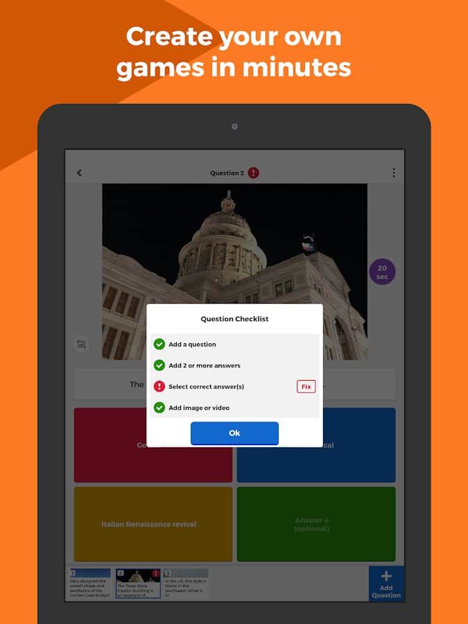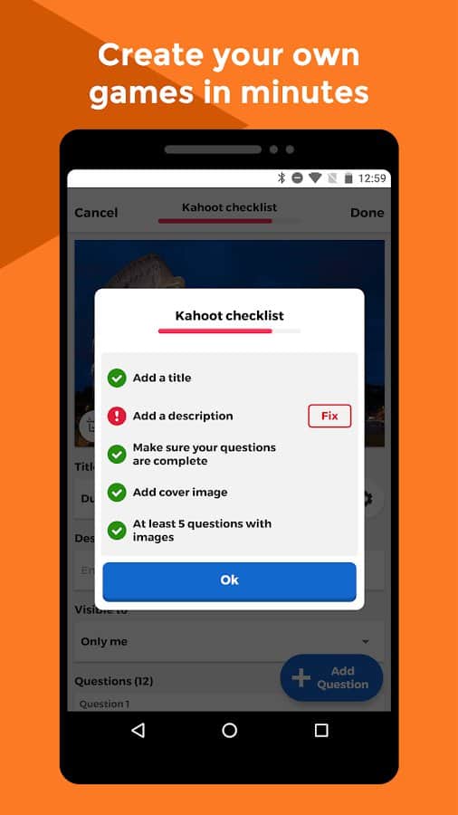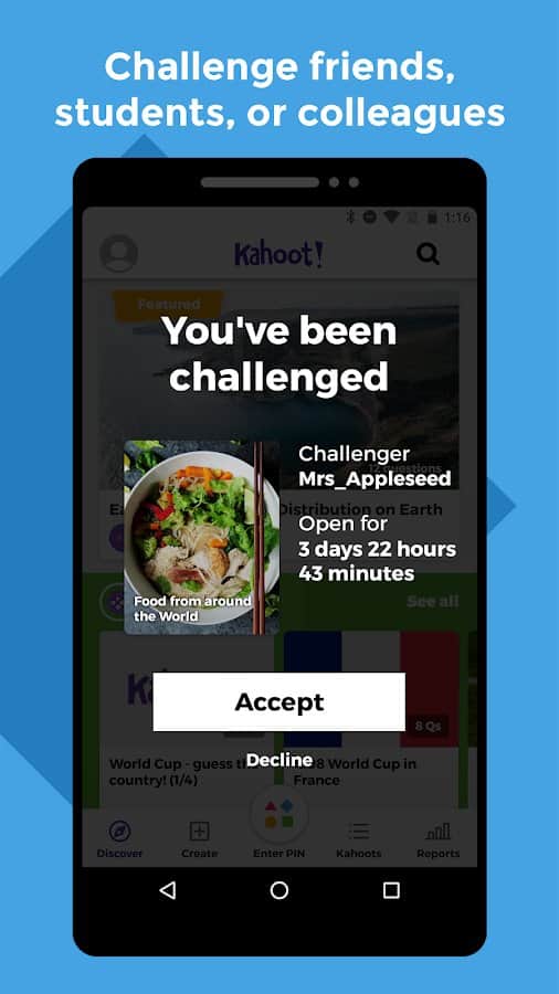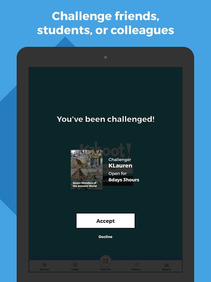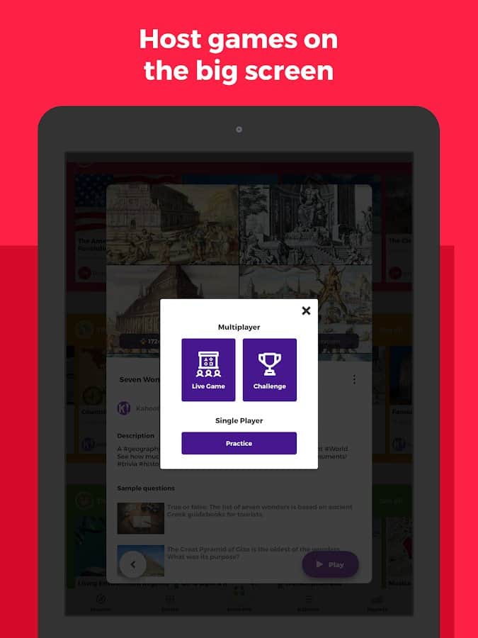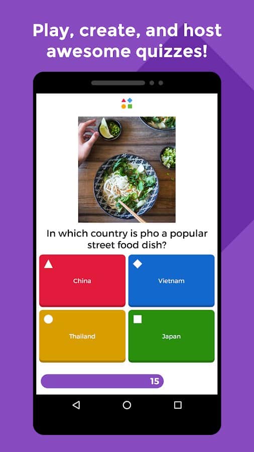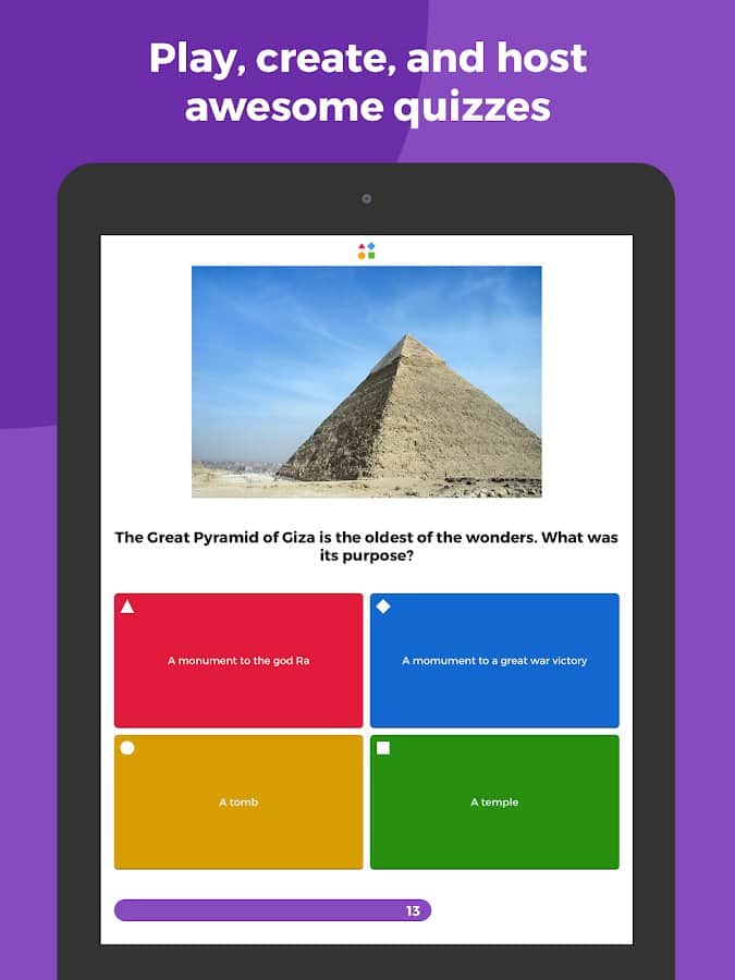 Kahoot! hafızayı, tepki hızını ve zeka oyununu mükemmel bir şekilde geliştirir. Belirli bir süre içinde farklı konularda testler ve bulmacalar çözerek bilgilerinizi kontrol edebilirsiniz. Oyunlar ve quizler oluşturarak öğretmenlerinizi, arkadaşlarınızı şaşırtabilir ve bilgiliğinizi ve yaratıcılığınızı sergileyebilirsiniz. Program ayrıca uygulama menüsünde ödevleri tamamlama ve uzaktan eğitimi oyun şeklinde alma imkanı sunar.