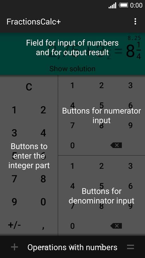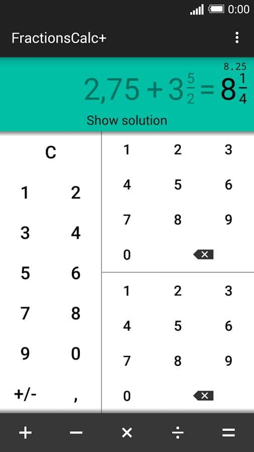 Kesir Hesaplayıcı / FractionsCalc+ - kesirlerle işlemler yapabilen güzel ve kaliteli bir programdır. Uygulamanın basit ve erişilebilir bir arayüzü vardır, kesirleri sadeleştirme işlevi mevcuttur ve sonuçların ondalık formatta eklenmesi ile ayrıntılı çözüm sürecinin gösterimi de bulunmaktadır.