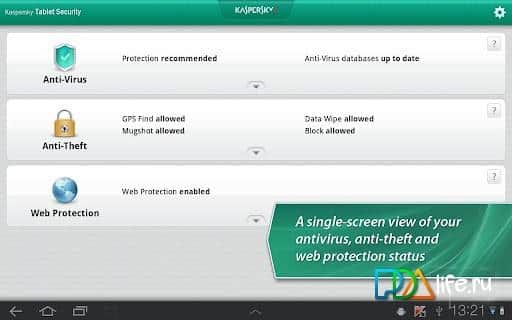 Kaspersky Tablet Güvenliği – işte sizin için özel olarak üretilmiş inanılmaz derecede akıllı bir koruma, Android tablet sahipleri için Kaspersky Lab geliştiricilerinden. Android cihazınızın kaynaklarını tüketmez ve gerçek zamanlı modda çalışır, böylece bir sinek bile gözden kaçmaz! =)