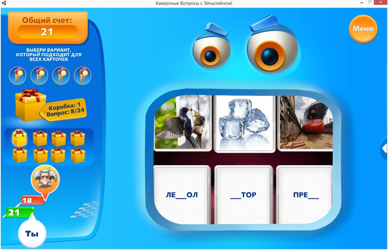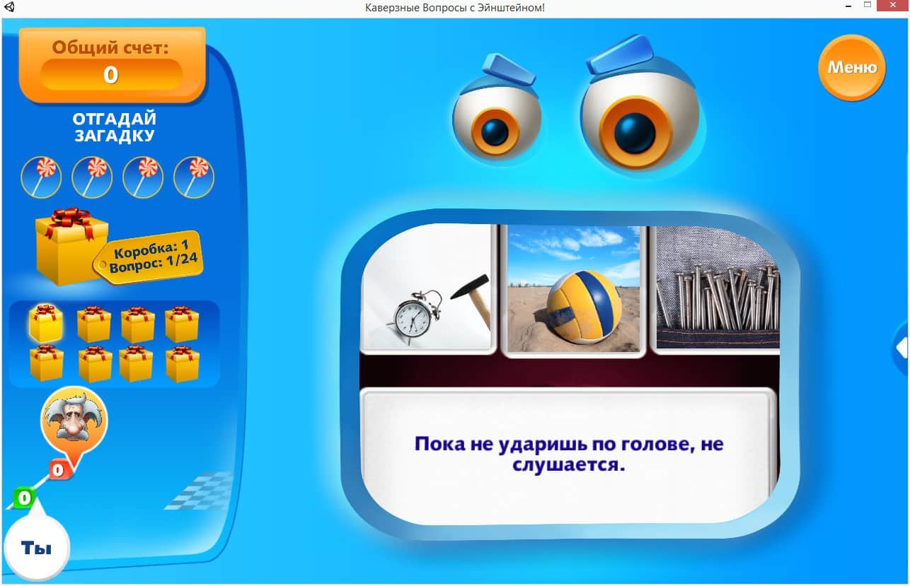 Einstein ile Zor Sorular - Android için popüler Zor Sorular oyununun yeni versiyonu. Bu oyunda, farklı soruları tahmin ederek Einstein ile bilgide rekabet edeceksiniz ve bunun için puan kazanacaksınız. Önünüzde nesnelerin, hayvanların, arabaların ve diğer şeylerin resimlerinin yer aldığı resimler belirecek ve bu resimlere dayanarak bilmeceleri, bulmacaları ve eksik harfleri tahmin etmeniz gerekecek. Einstein her yeni seviyede daha akıllı hale geliyor ve puanlarla sizi geçebilir, bu yüzden yeteneğinizi kaybetmeyin ve ona en zeki olduğunuzu kanıtlayın. Soruları size mavi bir yüz soracak, oyunun kurallarını açıklayacak ve zor anlarda size ipuçları verecektir.