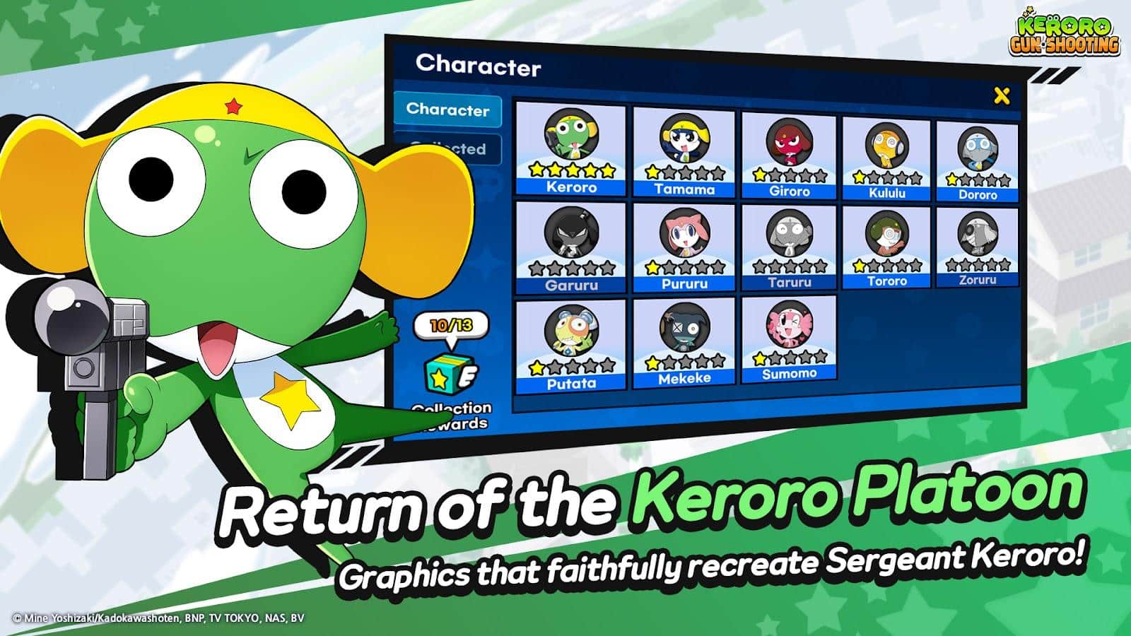 Keroro Gun Shooting - Pekopon'u fethetmek için görevde olan Sargeant Keroro, Keron gezegeninden özel taktik birliğin komutanı, bilgileri toplamak üzere Dünya'ya indi. Bu eğlenceli ve karizmatik kurbağalara inanılmaz bir macerada katılın, artık mobil cihazlarda da mevcut!