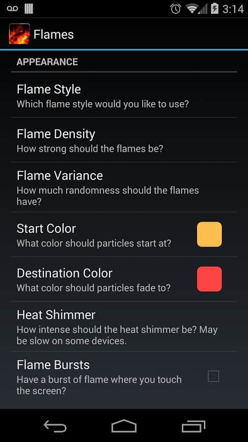 Son derece doğal görünüyor, yoğunluğu ayarlayabilir, arka planı (galeriden fotoğraf dahil) seçebilir, yükseklik, alev rengi ve daha birçok şeyi ayarlayabilirsiniz.