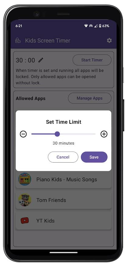 Çocuklar için ekran zamanlayıcı, çocuğun cihazın ekranında geçirdiği zamanı kontrol etmeye ve belirli uygulamalara erişimi sınırlamaya yardımcı olur. Bu, çocuklarının oyunlar veya sosyal medya ile geçirdiği zamanı sınırlamak ve öğrenmeye veya cihazsız dinlenmeye daha fazla zaman ayırmak isteyen ebeveynler için yararlı olabilir. İşte genellikle böyle bir uygulamanın nasıl çalıştığı: