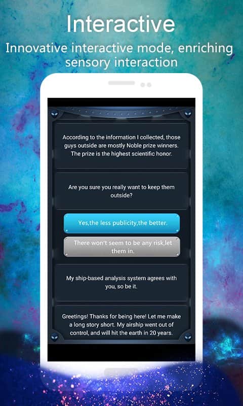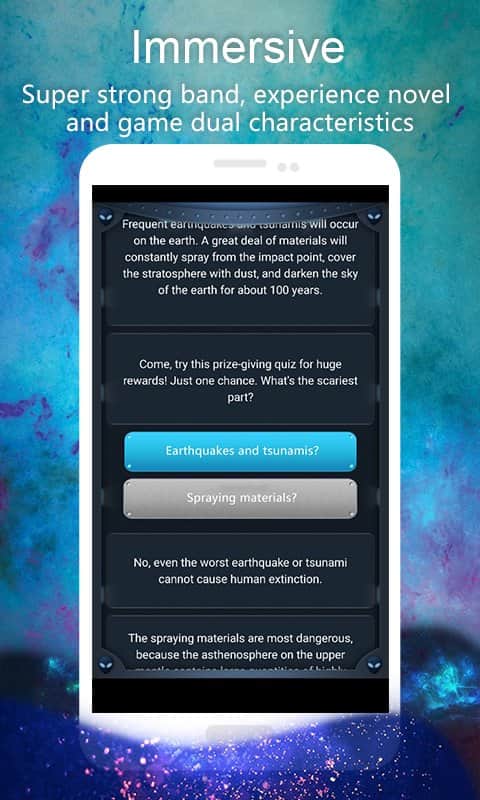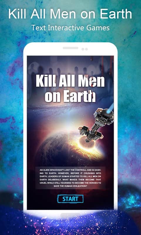 Dünyadaki Tüm Erkekleri Öldür: Metin Etkileşimli Oyunlar – insanlığın kaderini belirleyeceğiniz bir android etkileşimli oyun. Bu oyunda kıyamet günü geldi ve artık tüm insanlığın kaderi sizin ellerinizde. Kimlerin öleceğine ve kimlerin yaşamaya devam edeceğine karar vermek sizde. Gezegenimiz uzaylılar tarafından saldırıya uğradı ve gezegenimizin yok olma eşiğinde olduğuna dair bir hüküm verildi. Artık sizden tek beklenen doğru seçimi yapmak, insanlara hayatta kalmalarında yardım etmek ya da onları ölüme mahkum etmektir. Sorulan sorulara yanıt verin ve her yanıtla seçim yaparak dünyanın kaderini belirleyin. Oyun, kararlarınıza doğrudan bağlı olacak 40 saatten fazla oyun süresi ve 30 farklı son ile sizi mutlu edecek. Bu oyunda zamanda yolculuk yapabilir ve olayların seyrini değiştirmek için geri dönebilirsiniz.