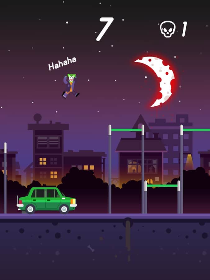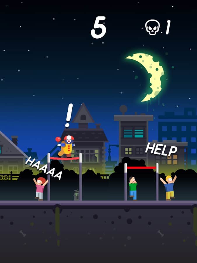 Katil Palyaço Takibi – Android için eğlenceli bir oyun, burada palyaçonun atlamalarını kontrol edeceksiniz. Katil palyaço serbest kaldı ve şimdi şehrin sokaklarında dolaşıyor ve insanları korkutuyor. Göreviniz, palyaçoya trampolinlerden atlayarak mümkün olduğunca fazla mesafe kat etmesine yardımcı olmaktır. Bir trampolinden diğerine atlayın ve ayrıca arabaların çatılarında hareket edin. Bu oyunu geçmek için, palyaçoya atlamalarında yardım ederken parmaklarınızın tüm çevikliğini göstermeniz gerekecek. Palyaçoyu şehirde yönlendirin ve birçok bonus ve güçlendirme toplayın. Eğer kahramanınız yere düşerse, oyun sizin için sona erecek ve her şeye yeniden başlamak zorunda kalacaksınız. Tüm palyaçoları açın ve kendi rekorunuzu belirleyin.