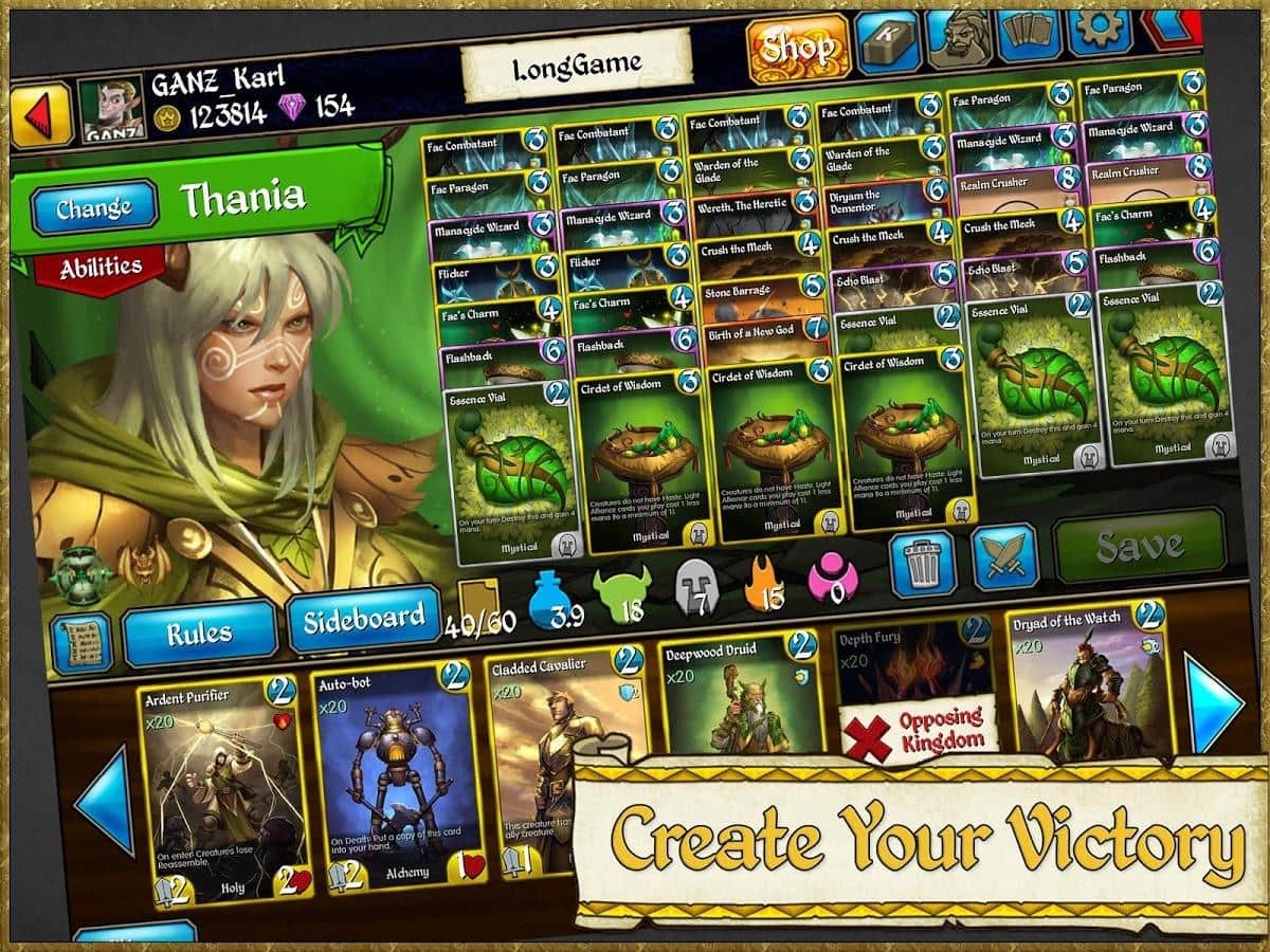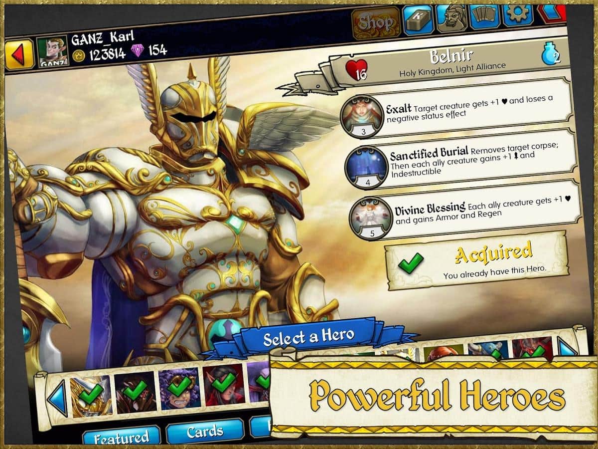 Altı güçlü krallıktan 27 kahramandan birini seçin. Her kahramanın belirli beceri ve yetenekleri vardır. Oyunda 900'den fazla kart bulunmaktadır, bu nedenle taktik ve strateji olanakları neredeyse sınırsızdır. Düzenli olarak yapılan ödül çekilişli turnuvalar oyuncuları oyunda gelişmeye teşvik ediyor.