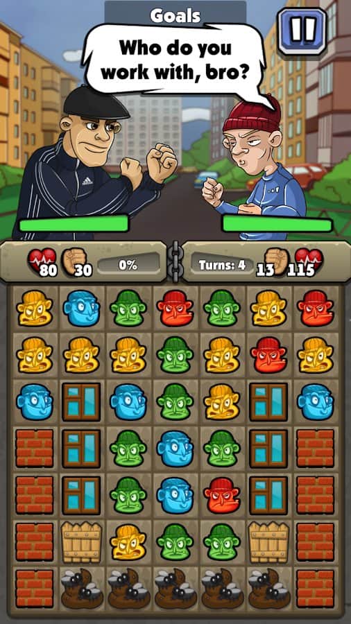 Kingpin. Ücretsiz üçlü eşleştirme – net bir oyun deneyimi sunan yeni bir Android oyunu. Bu oyunda sokak çeteleri, gangsterler ve hapishane alt kültürü dünyasına dalacaksınız. Üçlü eşleştirme türündeki bu oyunda göreviniz çeteleri yönetmek ve rakiplerinizle savaşmaktır. Üç veya daha fazla nesneden oluşan diziler oluşturun ve saldırı gücünüzü artırın. Rakibinizi bir darbe ile nakavt edin ve puan kazanın. Oyun tarafından sunulan çok sayıda ve çeşitli görevleri tamamlayın ve şehrin bölgelerini birer birer ele geçirerek Brateevsk'in patronu olun. Tüm dünyadan gerçek oyunculara meydan okuyun ve harika sonuçlar elde edin. Nesnelerden uzun zincirler oluşturun ve ödüller kazanın.