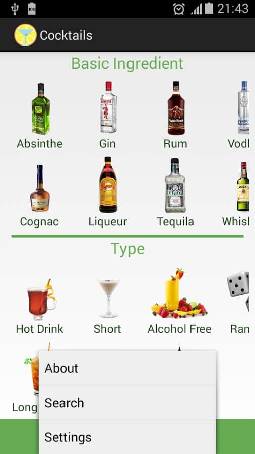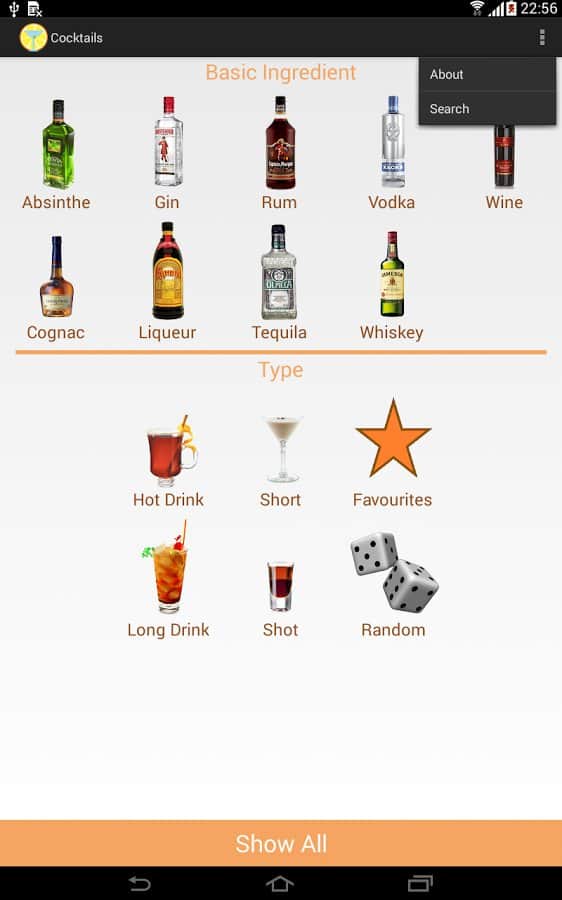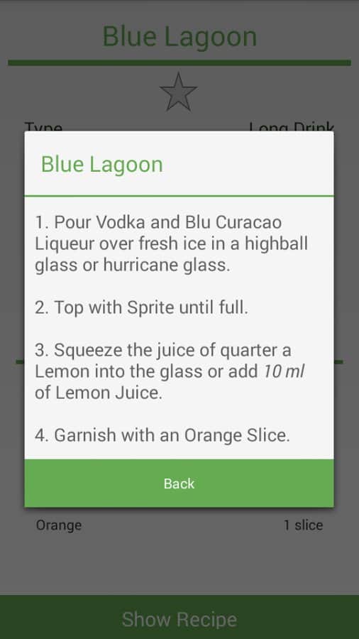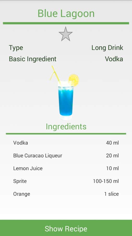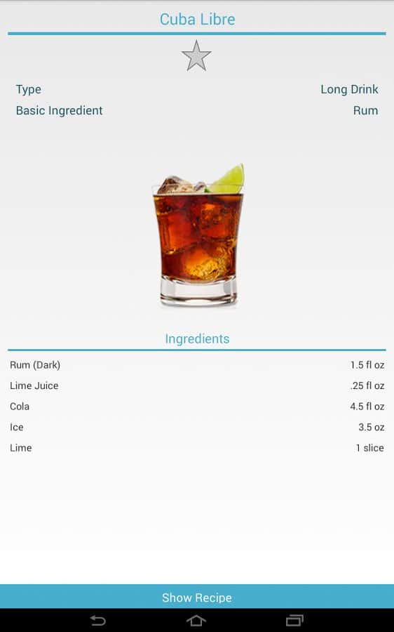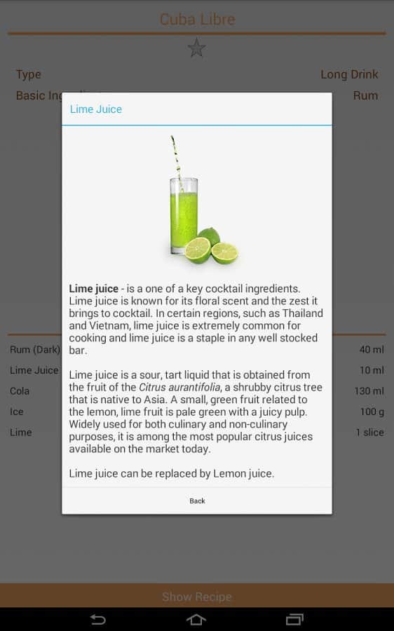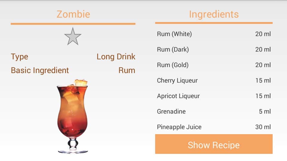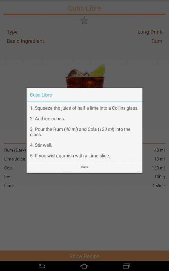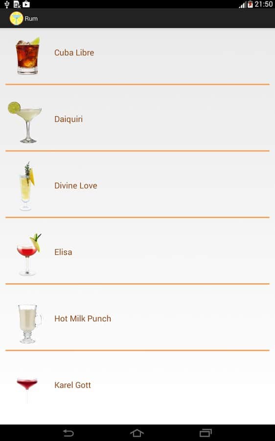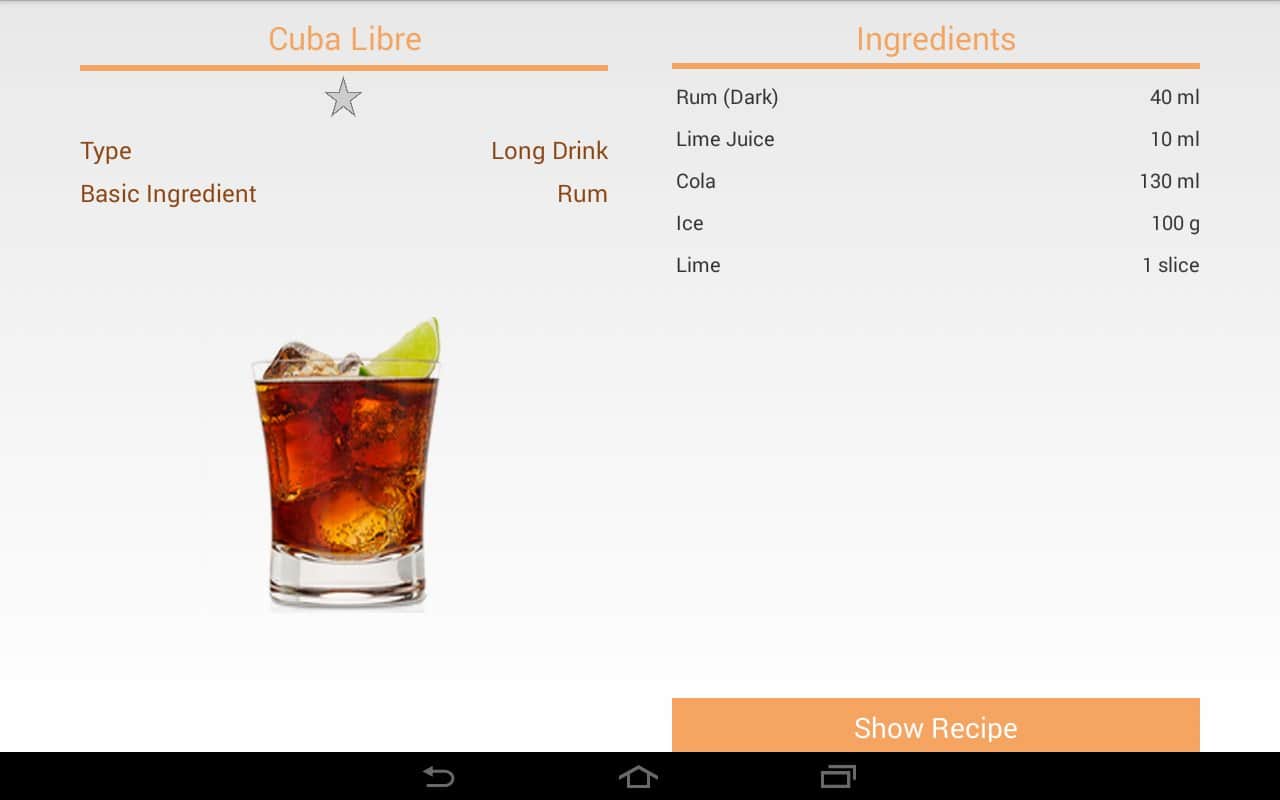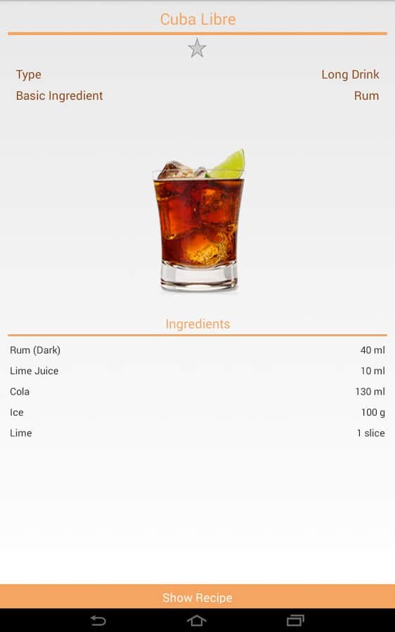 Uygulamada her şey son derece basit: gerçek bir arama yok, ancak kokteyl türüne veya bileşenlerine göre sıralamayı kullanabilirsiniz. İçecek konusunda karar verdikten sonra, fotoğraf, bileşenler ve detaylı tarifle ilgili sayfaya geçebilirsiniz.