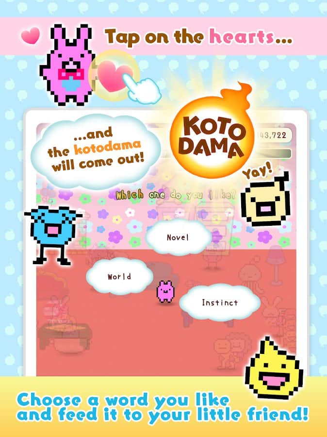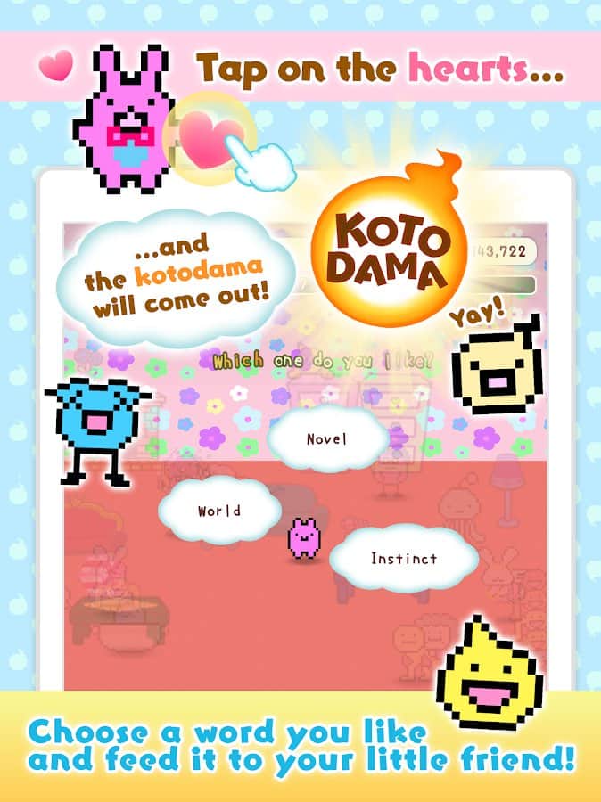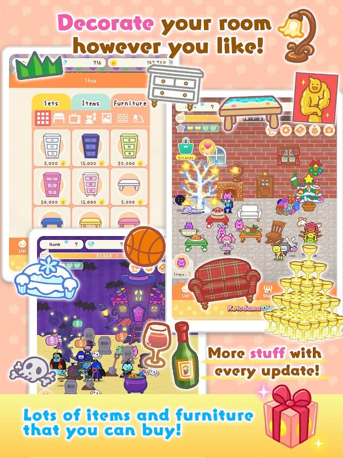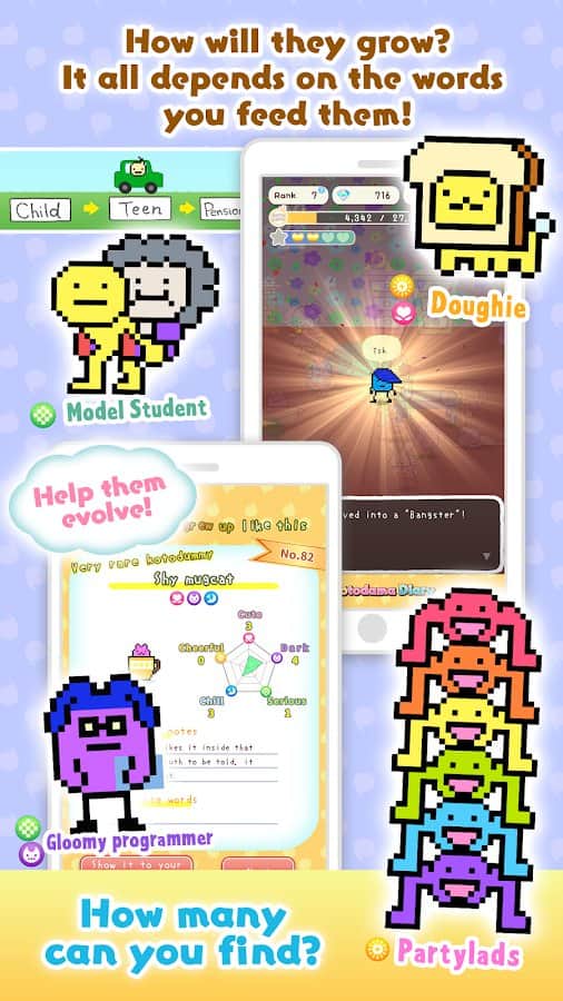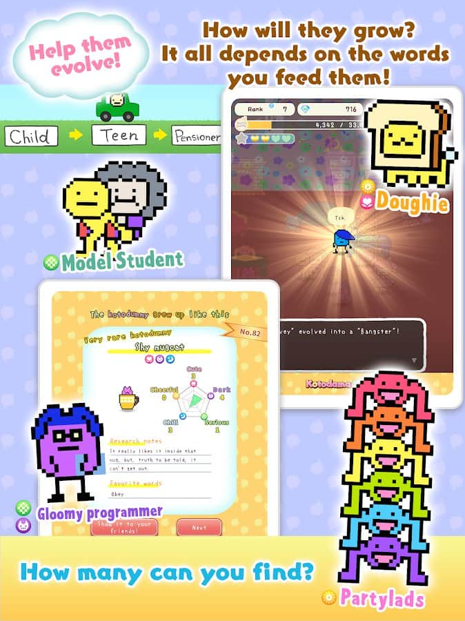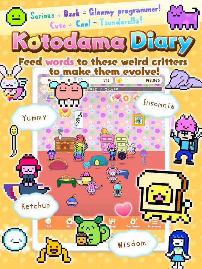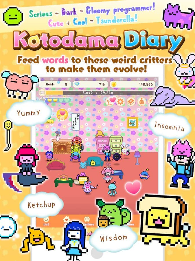 Kotodama Günlüğü - sadece çocuklar için değil, yetişkinler için de bir oyun! Sevimli, tuhaf, kötü, iyi, üzgün, mutlu veya hatta kaba karakterler yetiştirin ve onların minik hayatlarının bir parçası olun. Odayı güzel eşyalarla süsleyin, 'çocuklarınızla' diyaloglar kurun, ne kadar güzel olduklarını söyleyin ve doğru bir şekilde eğitin ki sonra pişman olmayın. Kalpler ve yıldızlar toplayın, deneyim ve paralar kazanın ve gerçek bir aile oluşturun fantastik ve tuhaf KotoDummi evcil hayvanlarından. Ayrıca, onlara aksesuarlar hediye edebilir ve bunun karşılığında bir şeyler alabilirsiniz.