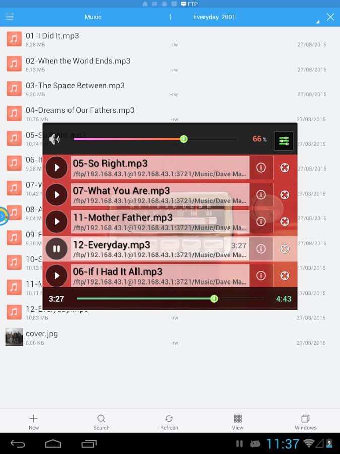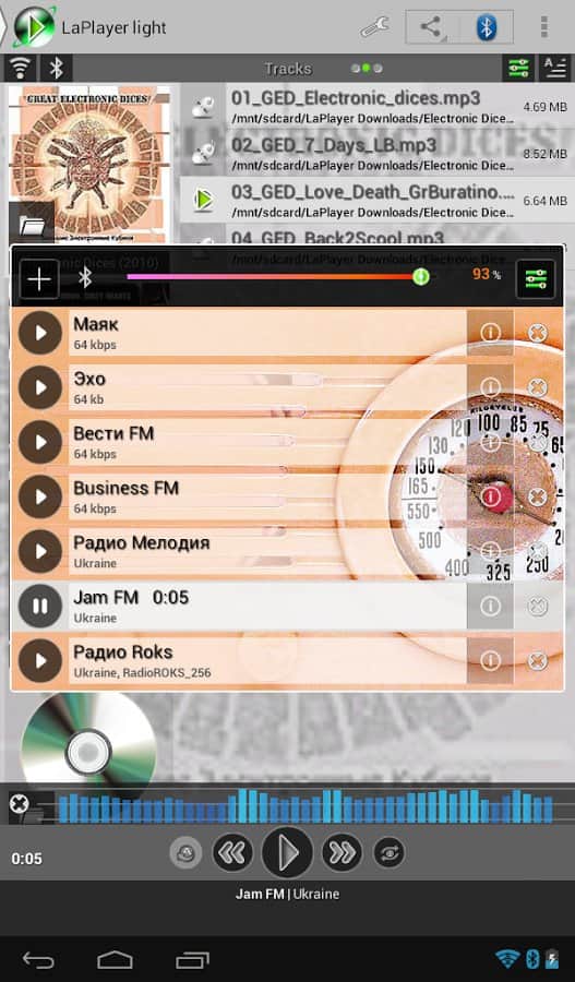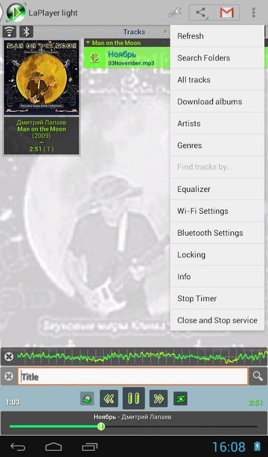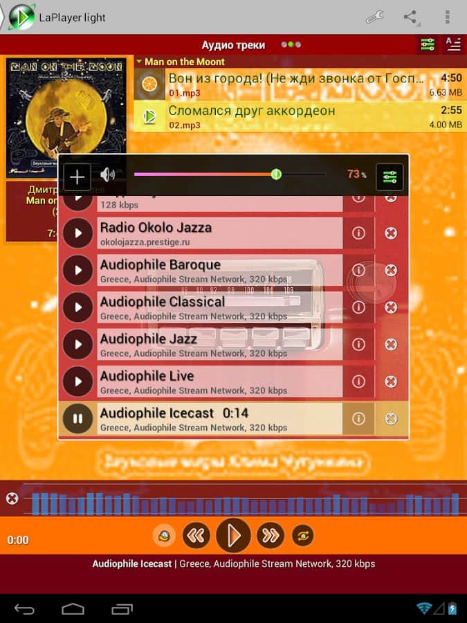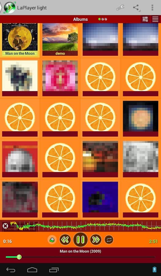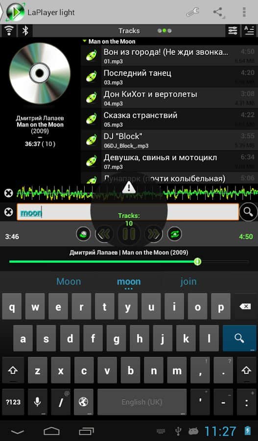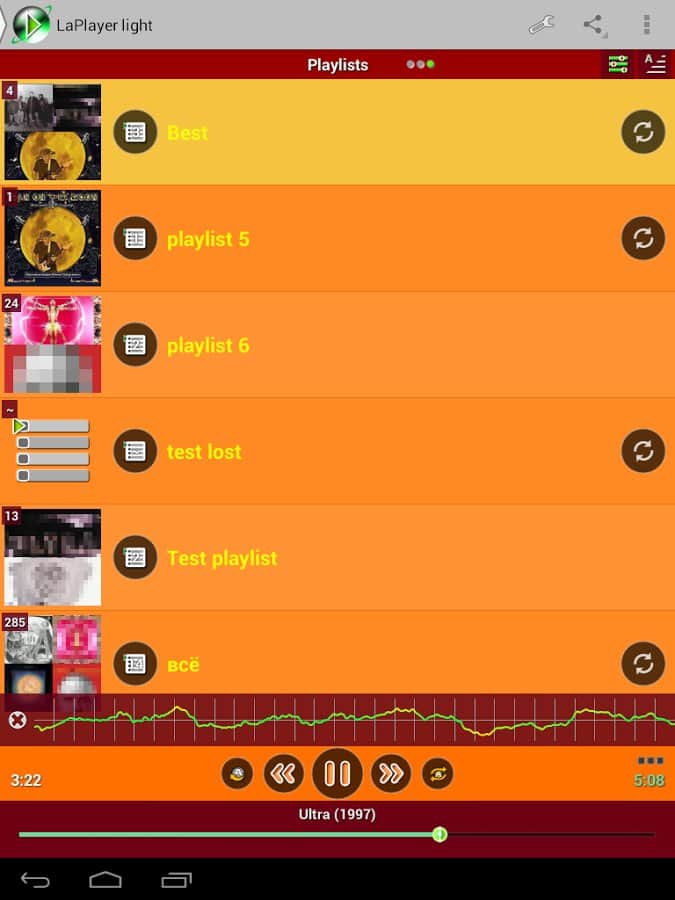 LaPlayer – geliştirici Dmitriy Lapayev'den Android cihazlar için mükemmel bir ses çalar olup, indirilen ses dosyaları için bir arayüz sunmaktadır. Uygulama üç ana pencere içermektedir: albümler, ses parçaları ve çalma listeleri. Ses dosyalarının aranması, hem medya veritabanında hem de cihazın harici depolama dizinlerinde gerçekleştirilir. "Klasör çalar" moduna geçmek için menüden "Klasörleri Ara" seçeneğini seçmek gerekmektedir. Uygulama çok sayıda özellik içermektedir, bu da bu ses çalar ile ilgilenmeyen kimseyi bırakmayacaktır. Keyfini çıkarın!