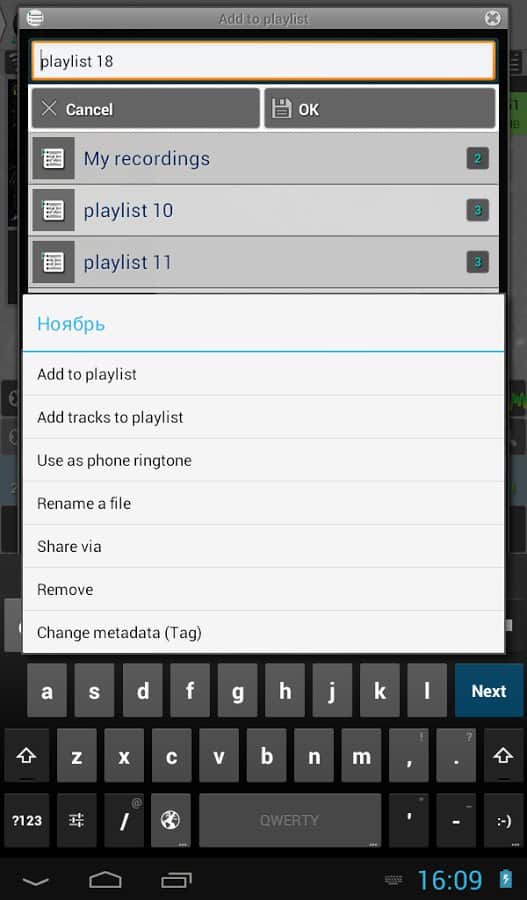 - Çalma listeleri ile ilgili işlemler: bir parçayı seçilen çalma listesine ekleme (parça listesi öğesine uzun basarak), birden fazla parçayı çalma listesine ekleme, parçaların çalma sırasını değiştirme, listeden parça silme, yeni bir liste oluşturma, liste silme, listeyi yeniden adlandırma;