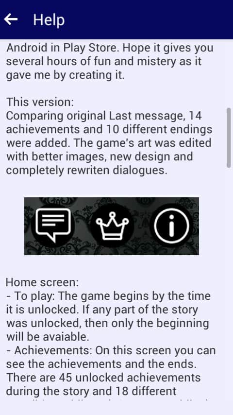 Son Mesaj Artı – Android için korkutucu bir oyun, burada bir felakete uğramış tanımadığınız biriyle yazışacaksınız. Telefonunuza tanımadığınız bir numaradan mesajlar gelecek ve bu kişi sizden yardım isteyecek. Göreviniz, çeşitli yanıt seçeneklerinden doğru olanını seçmek ve kişiye zor bir durumdan çıkmasına yardımcı olmaktır. Kahramanı bir labirentte ve kanınızı donduracak varlıkların karşılaşabileceği karanlık tünellerde yönlendirin. Doğru seçimi yapın ve 45 başarıyı açığa çıkarın. Oyunda 18 farklı son seçeneği bulacaksınız.