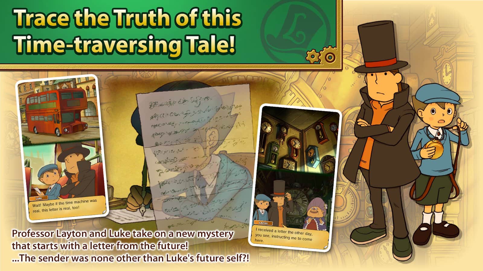 Profesör Layton'un dünyasını keşfedin - olağanüstü bir gelecek Londrası - ve bulmacaları parmağınızın ucuyla çözün. Birçok ilginç bulmacayı çözdükten sonra, ünlü arkeolog Profesör Layton oldukça tuhaf bir mektup alır. Bu mektubun göndereni, hiç şüphesiz, onun asistanı Luke'tur... ama 10 yıl sonradan! "Gelecek Luke" zor durumda kalmıştır. Bildiği ve sevdiği Londra, tam bir kaos içinde kalmıştır. Başlangıçta Luke'un sadece şaka yaptığını düşünen profesör, geçen hafta meydana gelen korkunç olayları hatırlamadan edemez - o zaman insanlığın ilk zaman makinesinin açılış töreni yapılmıştı ve ülkenin dört bir yanından birçok önde gelen kişi katılmıştı. Ancak gösterim sırasında zaman makinesi ters gitmiş ve halkı korkunç bir patlama ile sarmalamıştır. Orada bulunan birkaç kişi gizemli bir şekilde havaya karışmış, bunlar arasında Başbakan Bill Hawks da bulunmaktadır. Zaman makinesinin patlamasının bir şekilde bağlantılı olabileceği hissinden kurtulamayan Profesör Layton ve Luke, mektupta belirtilen yere - Boldwin'deki Midland Road'daki saat dükkanına - giderek, belki de karşılaştıkları en büyük gizemi açığa çıkarmaya çalışırlar.