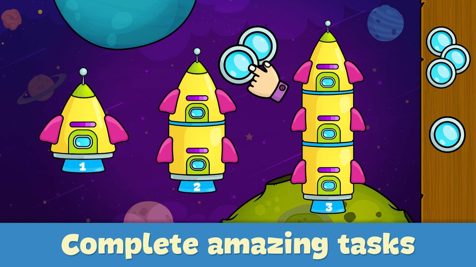 3 yaşındaki çocuklar için öğrenme oyunları – 56 farklı oyun içeren gelişimsel bir oyundur. Bu oyun çocuğunuzun ince motor becerilerini, koordinasyon yeteneklerini, mantıksal düşünme yetisini ve görsel algısını geliştirmesine yardımcı olacaktır. Bu oyun, evde eğitim uzmanlarının desteğiyle oluşturulmuştur ve 1 yaşından itibaren bebekler için mükemmel bir seçimdir. Bu oyunda çocuğunuz, boyutlar arasındaki farkı ayırt etmeyi, şekilleri formlarına göre sıralamayı, sayıları öğrenmeyi, hafızasını geliştirmeyi ve renkleri tanımayı öğrenecektir.