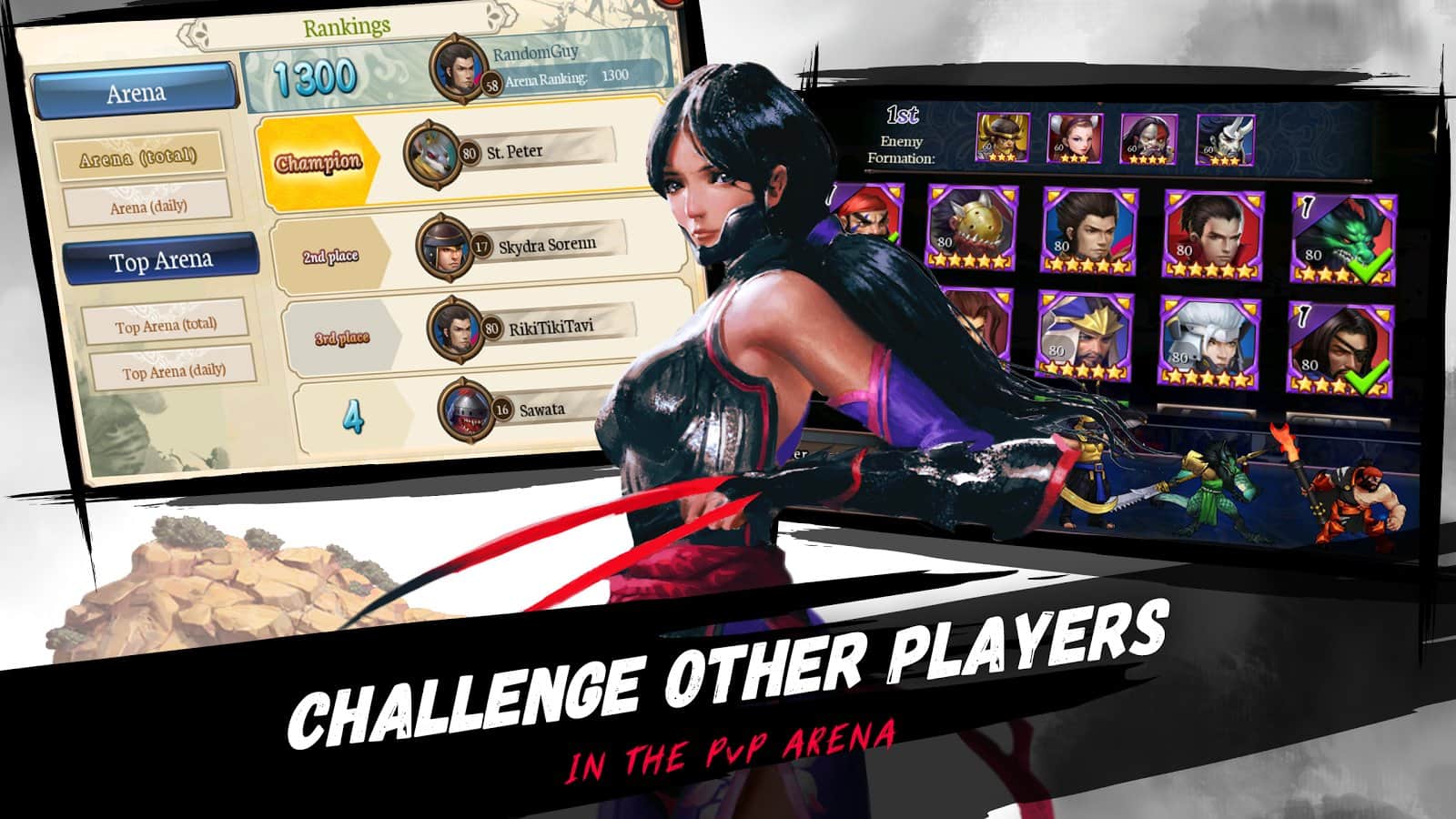 100 Kahramanın Efsaneleri - 100 efsanevi savaşçı, herhangi bir savaşçıyla savaşmaya ve cesurca darbeyi üstlenmeye hazır. Hikaye, sizi renklerle dolu ve tehlikeli maceralarla dolu bir dünyaya hazırladı. Savaşlar, kılıçla yapılan ilk darbeden itibaren heyecan verici ve hem NPC'lere hem de gerçek insanlara karşı oynama imkanı, bu strateji rol yapma oyununu daha da ilginç hale getiriyor. Oyunda kendi tarzınızı bulma peşinde olacaksınız. Takımınızı toplayın ve savaş alanında güçlerini doğru bir şekilde dağıtın - taktiksel becerilerinize bağlı olarak savaşın sonucu değişir. PvP modunda neler yapabileceğinizi gösterin.
