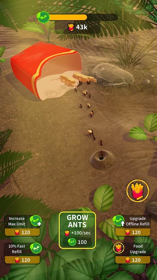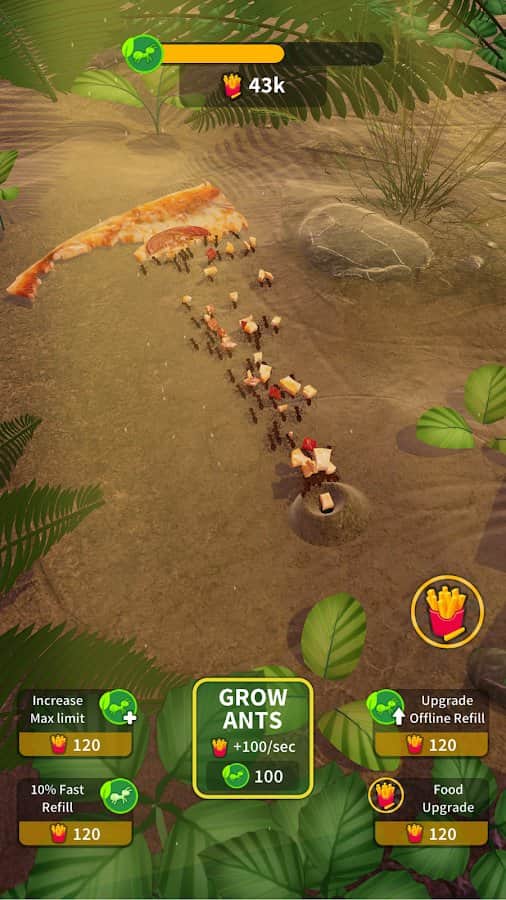 Küçük Karınca Kolonisi - unutulmuş ya da terkedilmiş insan yiyeceği kesinlikle ziyan olmayacak, eğer çevrede bir karınca kolonisi varsa. Bu çalışkanlar seve seve yiyecekleri kendi yuvalarına taşıyacaklar. Ne kadar çok yiyecek olursa, o kadar çok karınca yuvanızda olacak. Tüm bir karınca kolonisini yönetin, hatta en küçük kırıntıları bile özenle toplayın. Kişisel olarak, yiyecek yeme fiziğini beğendim. Suyun, ateşin ve karıncaların bir dilim pizzayı nasıl taşıdığına sonsuza dek bakılabileceğini anladım =)