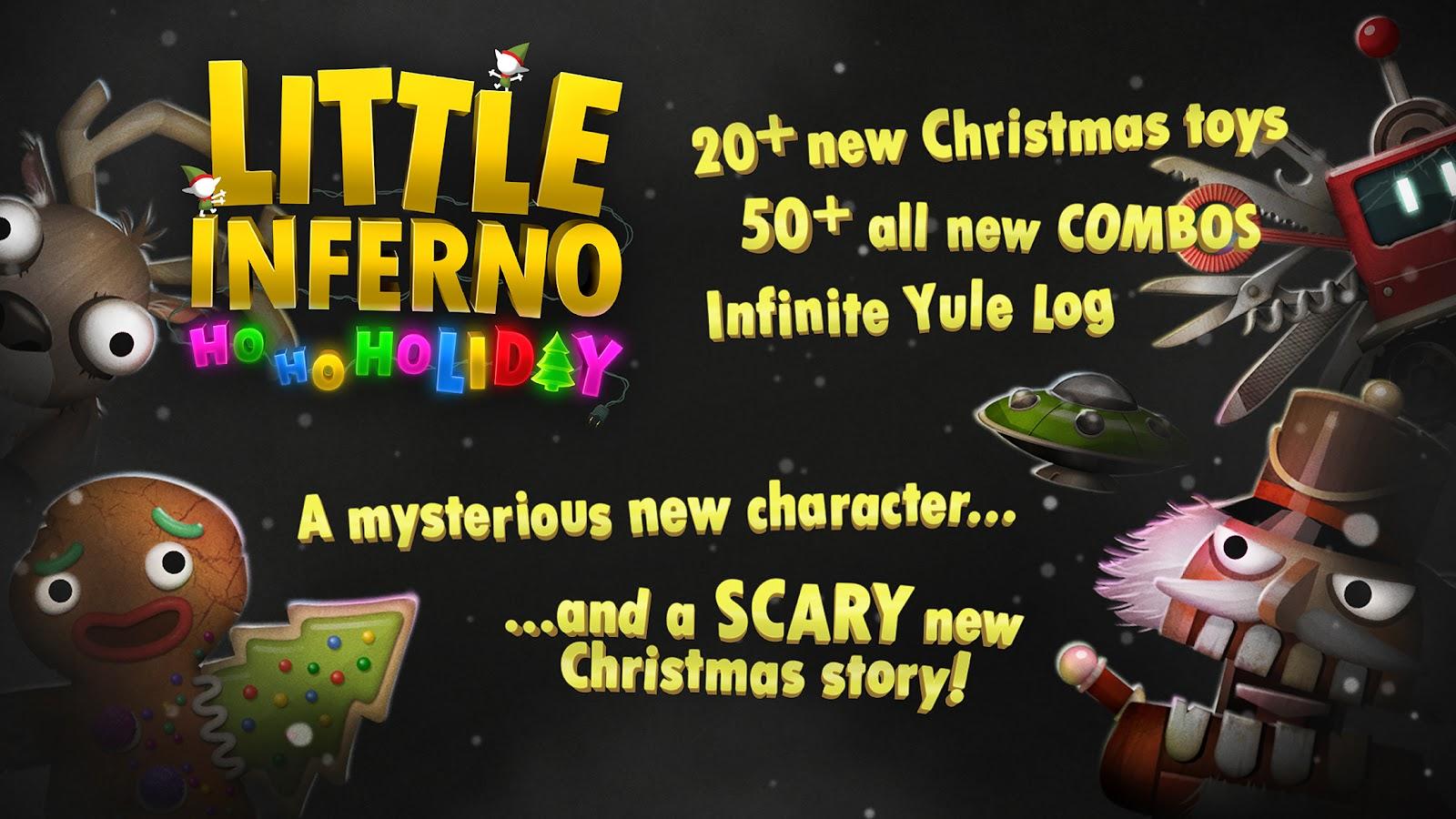Little Inferno – Android için bir oyundur ve bu oyunda, şömineye çeşitli eşyalar yakacaksınız. Eski oyuncaklar, arkadaşlarınızın mektupları, robotlar, araba modelleri, minik nükleer reaktörler ve daha birçok şeyi şömineye atın. Yaktığınız eşya sayısı arttıkça daha fazla para kazanacaksınız ve bu parayı çeşitli hoş bonuslar almak için harcayabilirsiniz. Oyun, soğuk kış akşamlarında sizi ısıtacak.