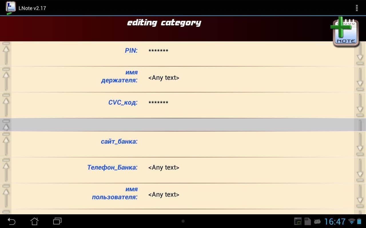 Lnote Android için. Şifrelenmiş biçimde her türlü veriyi saklayıp yapılandırmanıza olanak tanıyan güçlü bir organizatör. Program internet erişimi gerektirmez, ancak Google Drive, DropBox vb. ile senkronize olabilir. Dosyaya erişim şifrenizi unutursanız veya kaybederseniz, verilerin geri kazanılması mümkün değildir. Lnote, işinize yarayacak birçok özellik ve işlev içerir.
