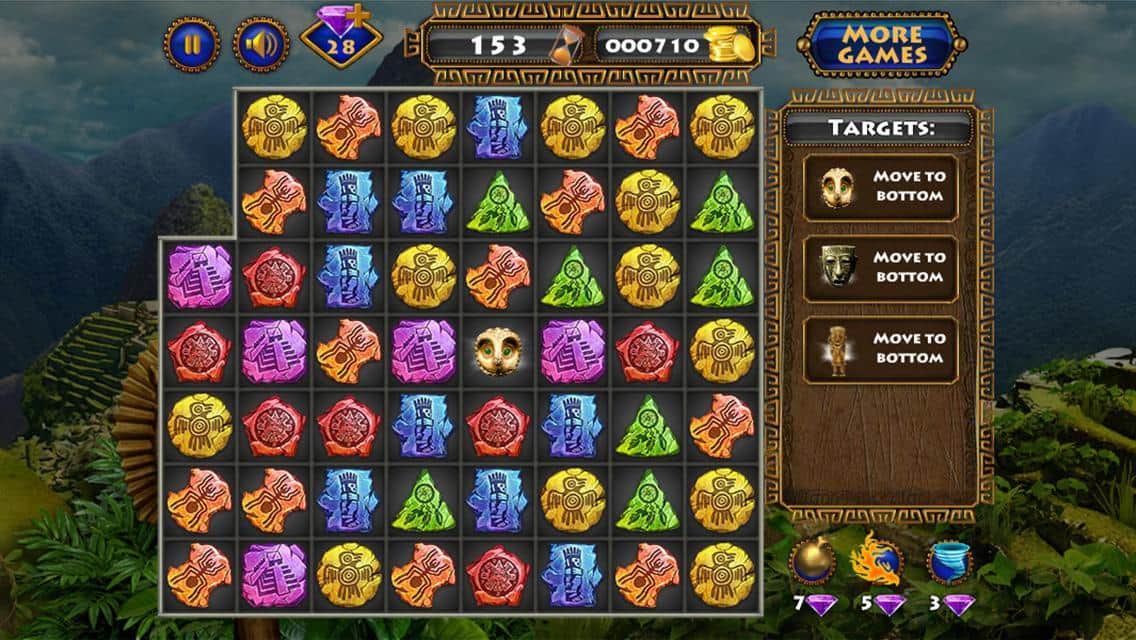 Kayıp İnka Altını – cesur bir kaşif ve İnka kabilesinin antik hazinelerini ve eserlerini arayan bir maceracı olarak oynuyoruz. Unutulmaz maceramızın başlayacağı Machu Picchu şehrine doğru yola çıkıyoruz. Oyun, 'üçlü eşleştirme' türünün klasik bir örneğidir. Oyun alanında çeşitli antik yazıtlarla dolu piktogramlar dağınık bir şekilde yer almaktadır. Yazıtlar farklı renklere sahiptir; aynı renkten üç veya daha fazla yazıtı toplamanız gerekiyor ve bunlar ekrandan kaybolacaktır. Aynı anda daha fazla yazıt kaybolursa, o kadar çok puan kazanırsınız ve kombinasyonlar daha yüksek bir puan değerine sahiptir.