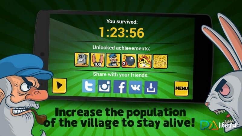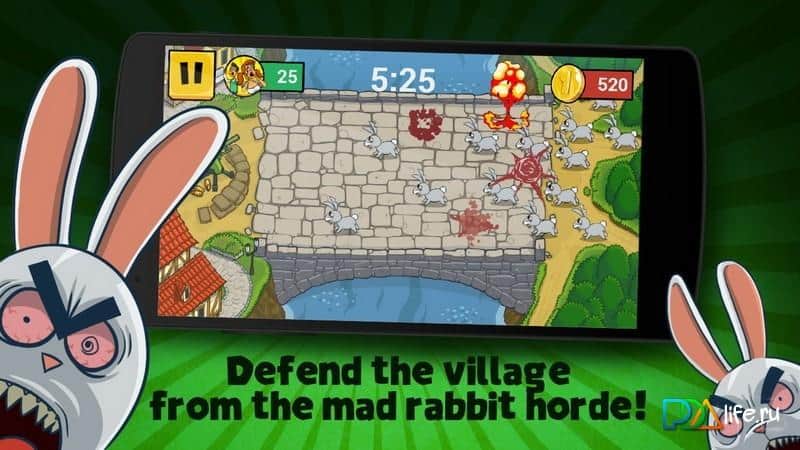 Deli Tavşanlar: Vuruş - orman tavşanlarının hangi mantarlarla beslendiğini bilemiyorum, ama kulaklılar ormandan çıkıp küçük bir kasabayı fethedeceklerini düşündüler. Şehre giden yolda, tavşanların geçtiği bir köprü var, ancak cesur yaşlı bir koruyucu onların yolunu kapattı; belki bu dedemiz Mazay, uzun zamandır yaptığı bir hatayı düzeltmek istedi ya da belki sadece tavşancıkları tatmak istedi, ama bu artık o kadar da önemli değil. Önemli olan, tavşanları vurmak için etkileyici bir cephaneye sahip olması ve bunu kesinlikle kullanacağız. Tavşanları vuruyoruz, paraları topluyoruz, silahı geliştiriyoruz, tekrar tavşanları vuruyoruz, av etiyle mantı yiyoruz, tekrar silahı geliştiriyoruz, şapkalar dikiyoruz ve bu şekilde kulaklıları tamamen yok edene kadar devam ediyoruz.