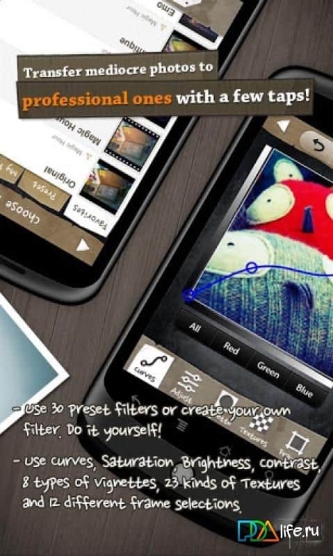 Magic Hour - Foto Editörü - Bu, fotoğraflara çeşitli efektler eklemeyi seven insanlar için bir uygulamadır, örneğin Instagram için. Filtreleri düzenleyin ve kendi efektlerinizi oluşturun ve bunları favori olarak kaydedin, dünyayla paylaşın. Filtrelerinizi yükleyerek bunları arkadaşlarınızla doğrudan Magic Hour üzerinden paylaşabilirsiniz. Uygulamada profesyonel fotoğrafçılar tarafından yapılmış, retro tarzında 38 hazır filtre bulunmaktadır. Ayrıca, diğer kullanıcılar tarafından oluşturulmuş filtreleri de yükleyebilirsiniz.