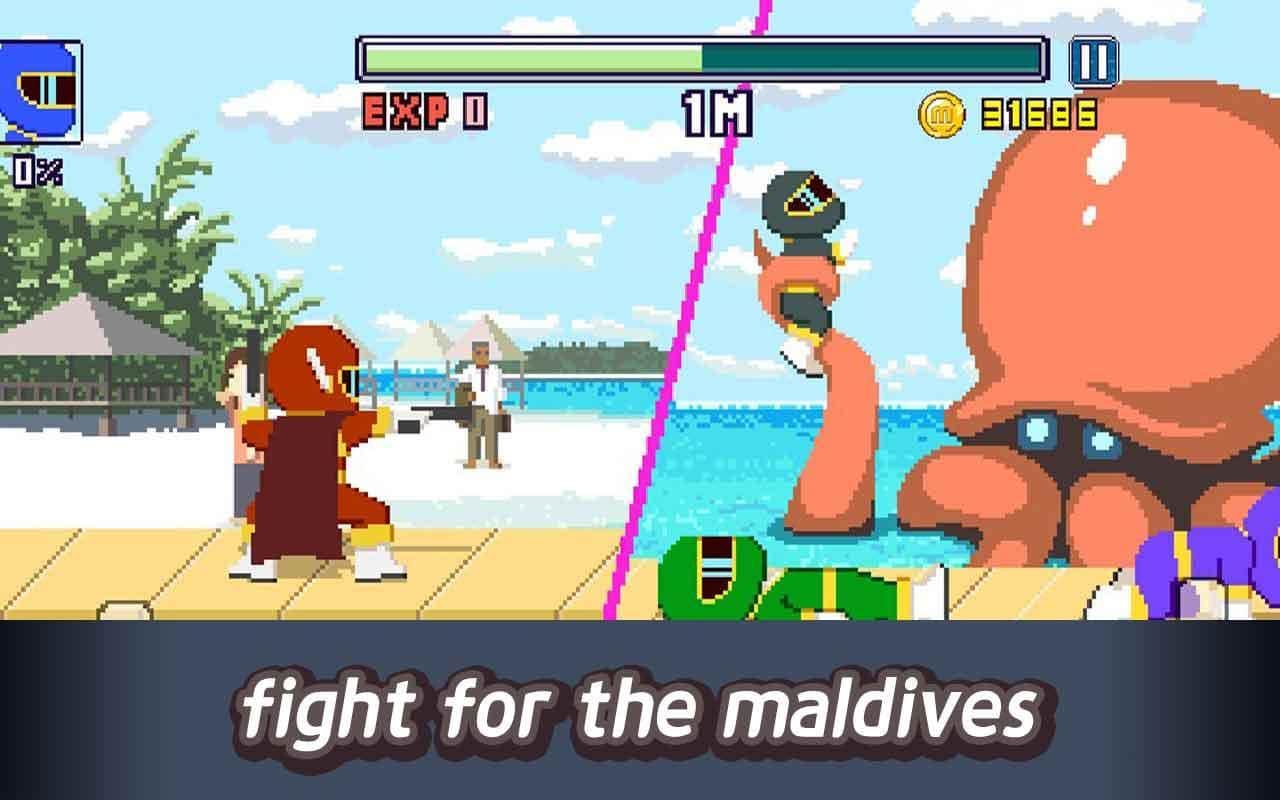 Maldivler Arkadaşlar: Piksel Flappy Savaşçı – plajda koşan ve yolundaki tüm engelleri yok eden eğlenceli bir kahramanı yönetin. Bu oyun sizi güneşli Maldiv Adaları'na götürecek, burada ana kahramanı yönetmeniz gerekecek ve zor bir yolu geçmek zorunda kalacaksınız. Kızımızın yolunda birçok engel, barikat ve düşman çıkacak. Ekranın sağ tarafına dokunarak kahramanınız ileri hareket edecek, sol tarafa dokunarak karakter düşmanları tekmeleyip itecektir. Yolda para toplayın ve karakterinizi kostümler ve aksesuarlar alarak geliştirin.