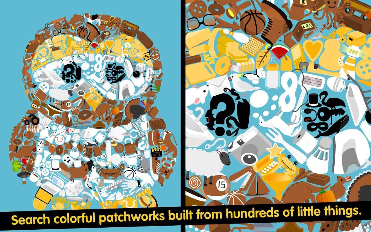 Küçük şeyler sonsuza dek - "Ben arıyorum" tarzında bir bulmaca oyunu, ancak çok sıradışı ve yaratıcı. Burada nesnelerin bulunduğu lokasyonlar yok, bunun yerine bir nesnenin veya hayvanın, örneğin bir baykuşun, görüntüsü var, ancak bu görüntü birçok küçük ve farklı nesneden mozaik prensibiyle oluşturulmuş. İşte bu nesnelerden gerekli olanları seçmeniz gerekiyor. Hepsini bulduğunuzda, bir bulmacanın parçasını alıyorsunuz ve bu şekilde seviye seviye ilerliyorsunuz, ta ki gerekli parça sayısını toplayana kadar. Bu parçalar daha sonra bir resim oluşturacak ve bu da bir sonraki seviye olacak. Oyunda 101 seviye ve 9 resim var!