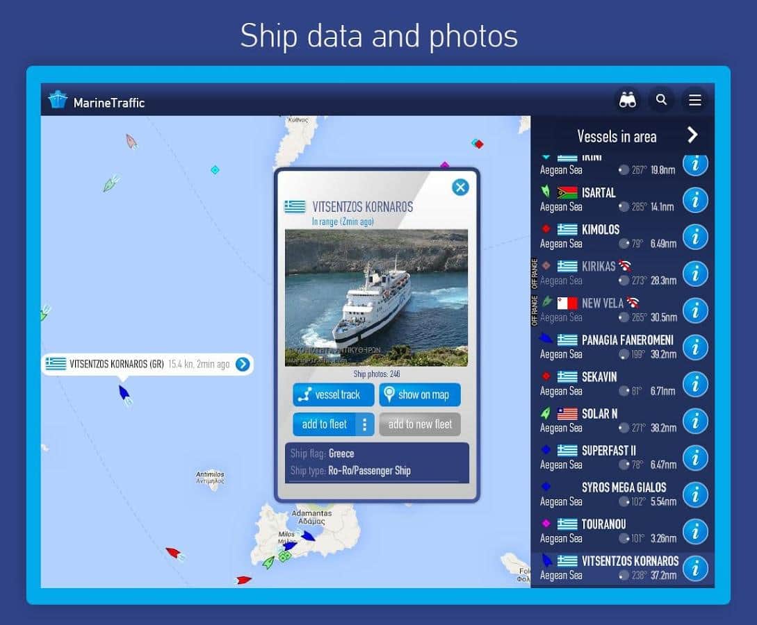 - Haritada gerçek zamanlı gemi görüntüleme, gemilerin, botların ve limanların aranması, çevrenizde neler olduğunu görme imkanı!