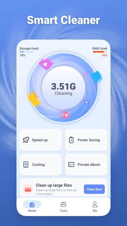 Telefon hafızasını her türlü gereksiz veriden düzenli olarak arındırarak, yalnızca hızlı çalışma ve performans sağlamakla kalmaz, aynı zamanda verilerin yüksek güvenliğini de temin edersiniz. Bu uygulama, kendi ihtiyaçlarınız için kullanabileceğiniz en gerekli işlevlerin hepsini bir araya getiriyor: kişisel bir albüm oluşturma ve onu gizleme, benzer fotoğrafları bulma ve tamamen silme, uygulamaların önbelleğini temizleme ve akıllı telefonda bir yerlerde birikmiş çok büyük dosyaları yok etme.